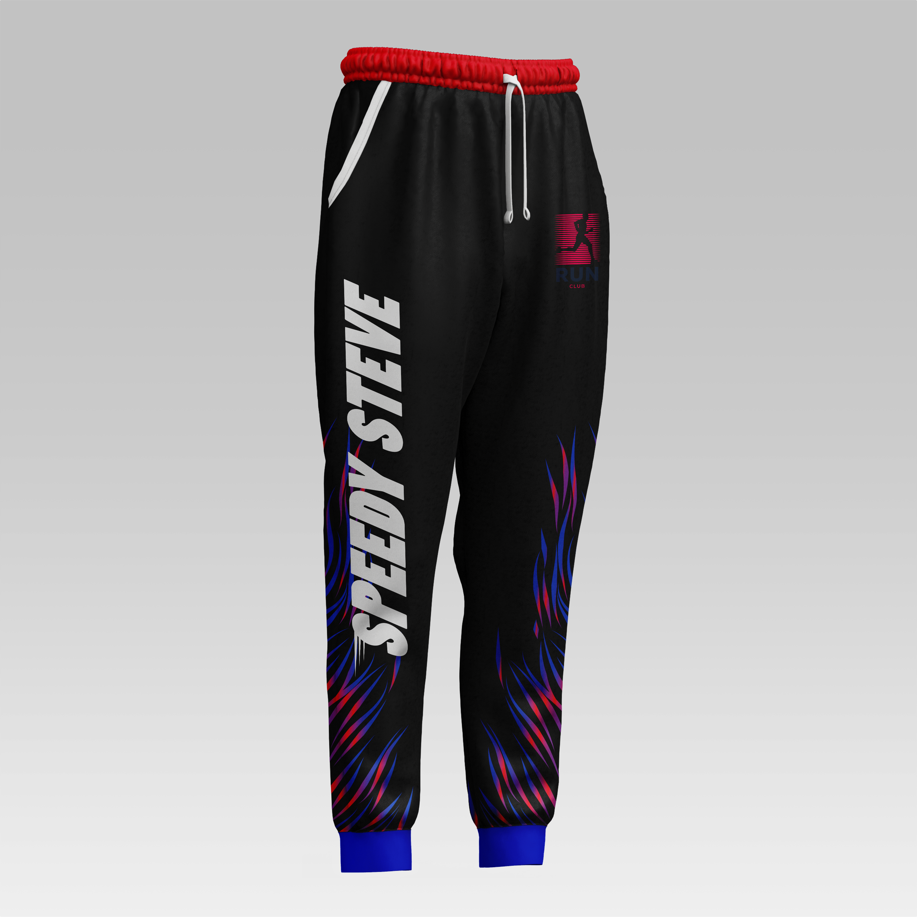 Black athletic pants with red and blue accents, and "speedy steve" text on the left leg, available in a mockup template.