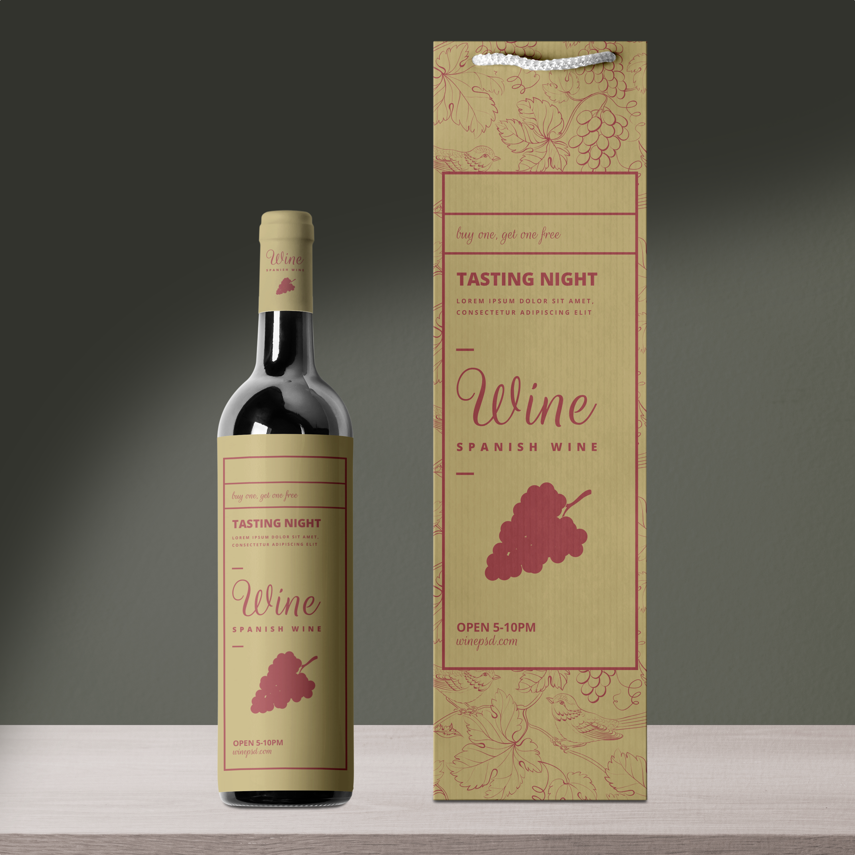 The mockup image features a stylish wine bottle and matching bag set against a minimalist dark background. The bottle and bag, adorned with elegant, wine-themed graphics and soft hues, exude sophistication. The design elements include grape illustrations and classic typography. Perfect for advertising a wine event or promotion, this mockup helps visualize the final product's market appeal. Use our mockup generator to create your unique design and share it on social media for maximum impact. Create your design now and showcase it to the world!