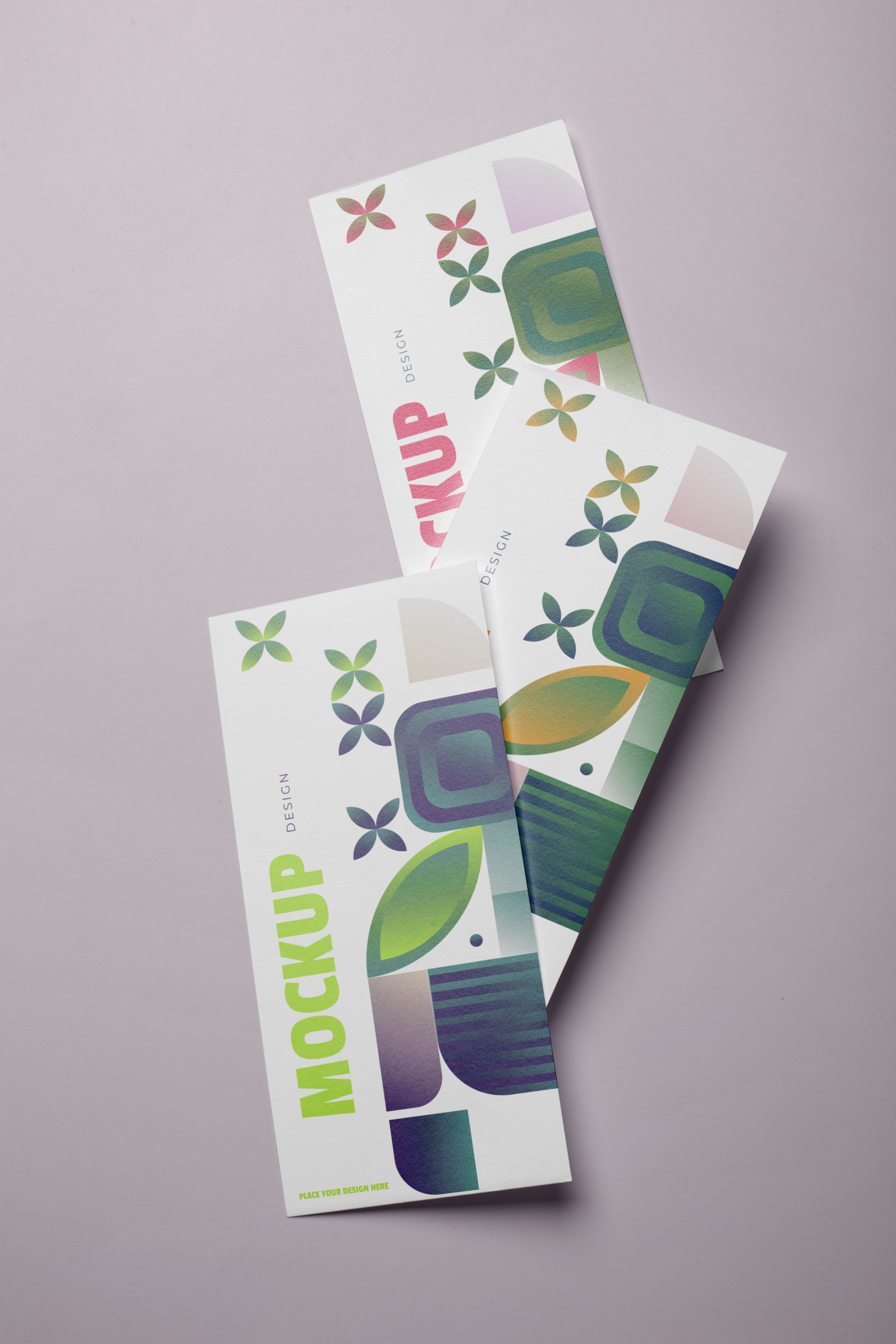 The mockup image features three overlapping cards set against a pale lavender background. Each card showcases a vibrant, geometric pattern with colorful shapes and floral designs in shades of green, purple, and pink. Use this mockup for advertising by placing your branding, promotional content, or event details on the cards. Enhance your marketing materials with this eye-catching design. Use our mockup generator now and share your stunning designs on social media to captivate your audience!