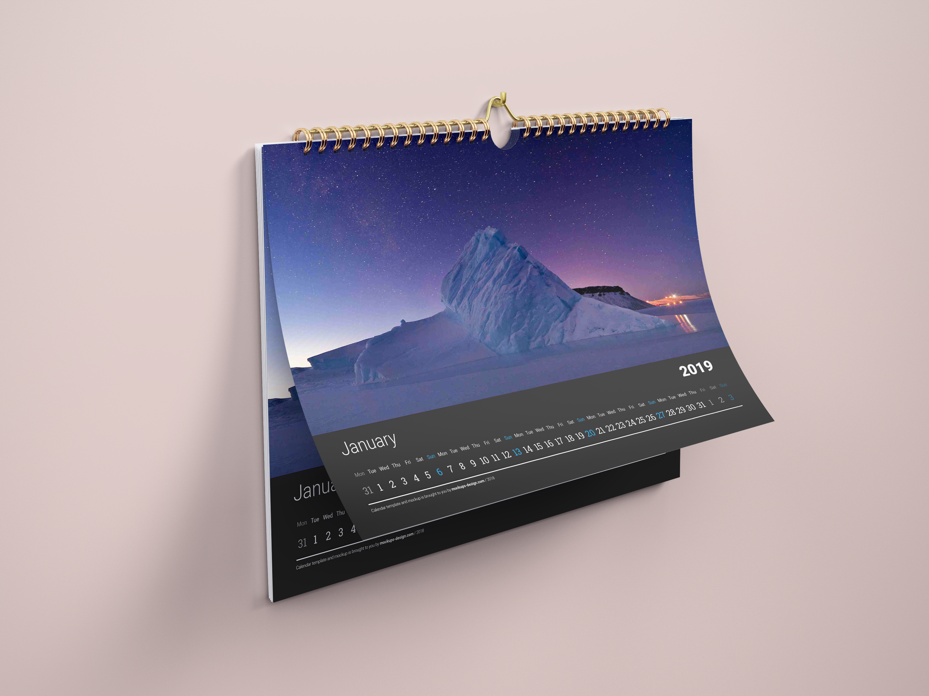 The mockup shows a wall calendar against a soft pink background. The calendar features a spiral binding at the top and displays a stunning snow-covered mountain scene under a starry sky for the month of January. Perfect for advertising your brand’s seasonal promotions, events, or highlights, this calendar mockup is ideal for creating eye-catching visuals. Use the mockup generator now and share your unique calendar design on social media to captivate your audience!