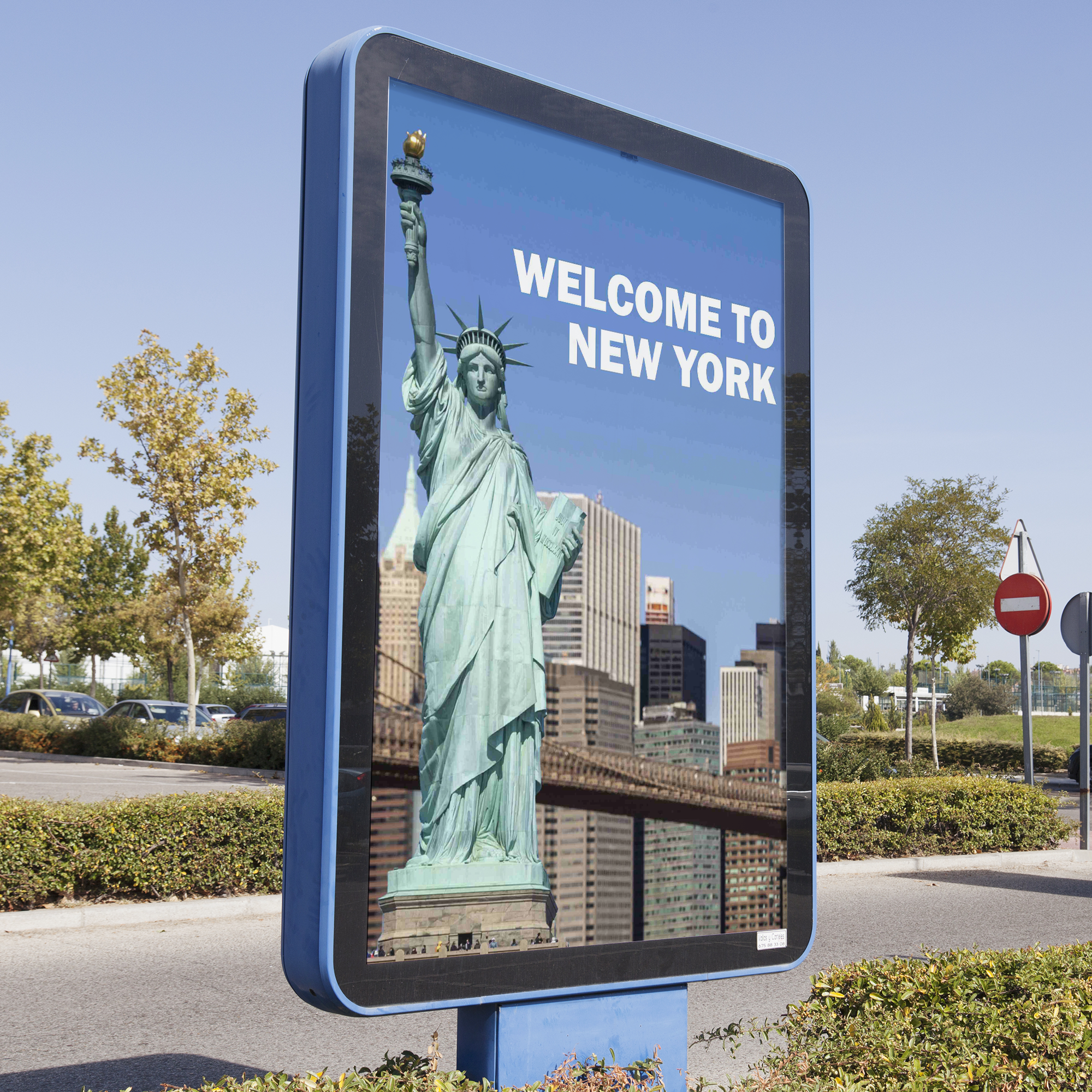 Digital billboard mockup displaying the statue of liberty with "welcome to new york" text.