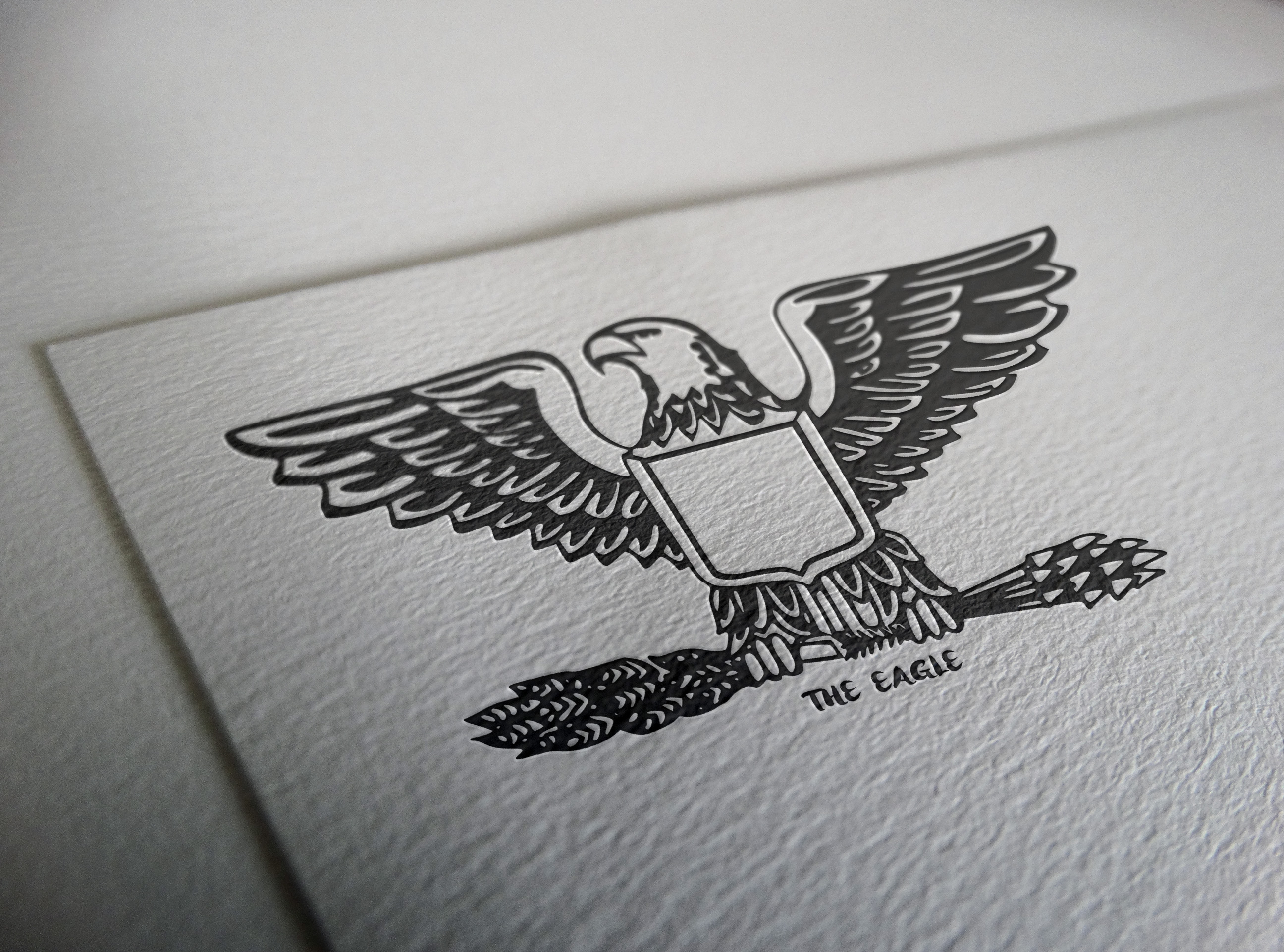 Embossed eagle design on textured paper, featuring a shield on its chest and holding arrows and an olive branch. This elegant mockup text reads "The Eagle.
