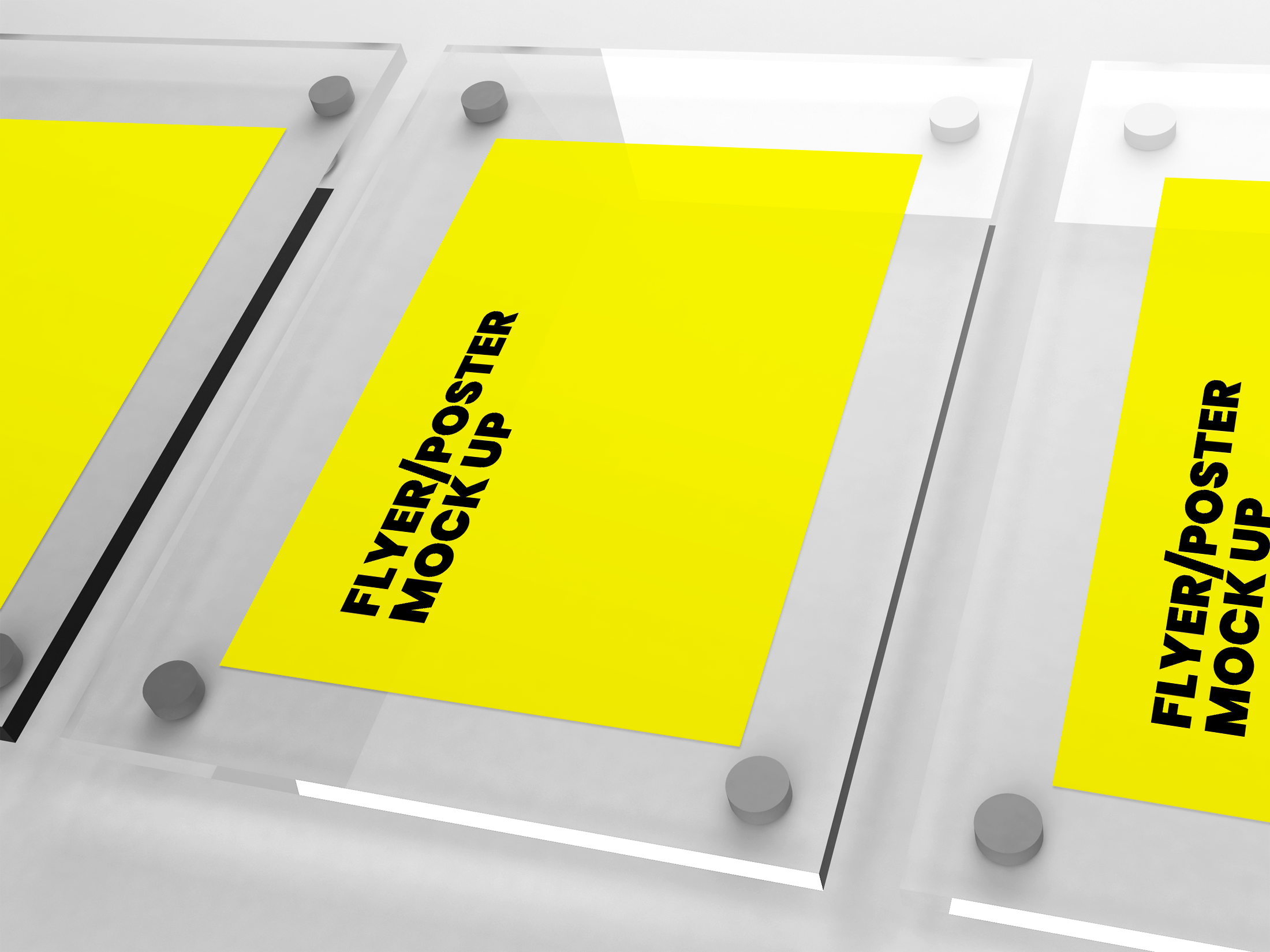 This mockup image showcases three posters placed on a clear, glossy surface, each secured by four round, metallic fasteners at the corners against a minimalistic background. The vibrant yellow posters stand out, making it ideal for advertising bright and eye-catching content. Use this mockup to present your flyer or poster designs professionally, enhancing visibility. Create your custom designs now using the mockup generator and share your stunning visuals on social media to captivate your audience!