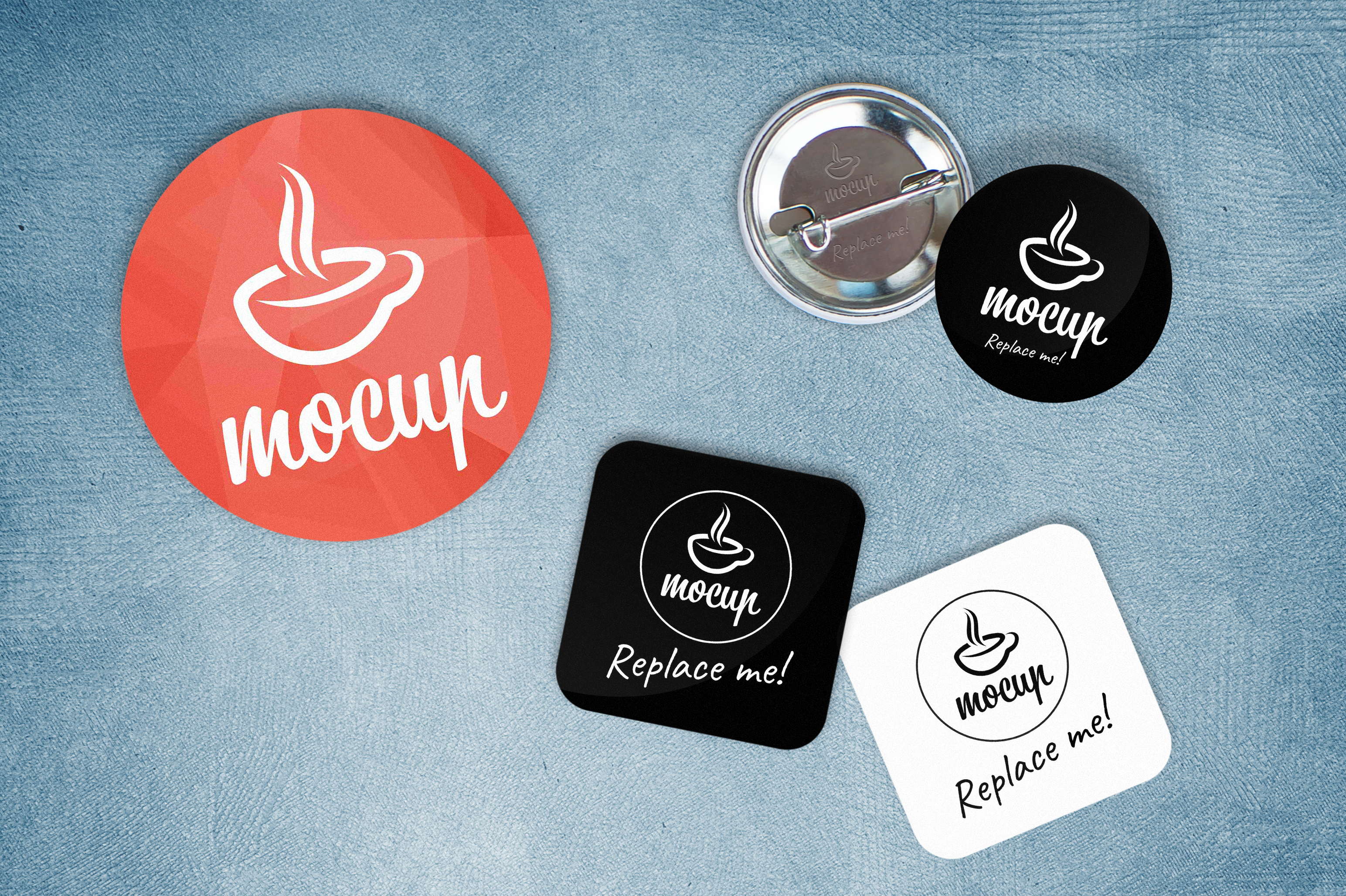 The mockup image features a set of round and square badges against a textured blue background. The main objects include two circular badges, one in red and the other in black, each showcasing a stylized coffee cup design. Two square badges, in black and white, complement the set with similar designs. The badges are well-suited for product branding or promotional materials. Use this mockup generator to visualize your unique logo and share your design on social media today!