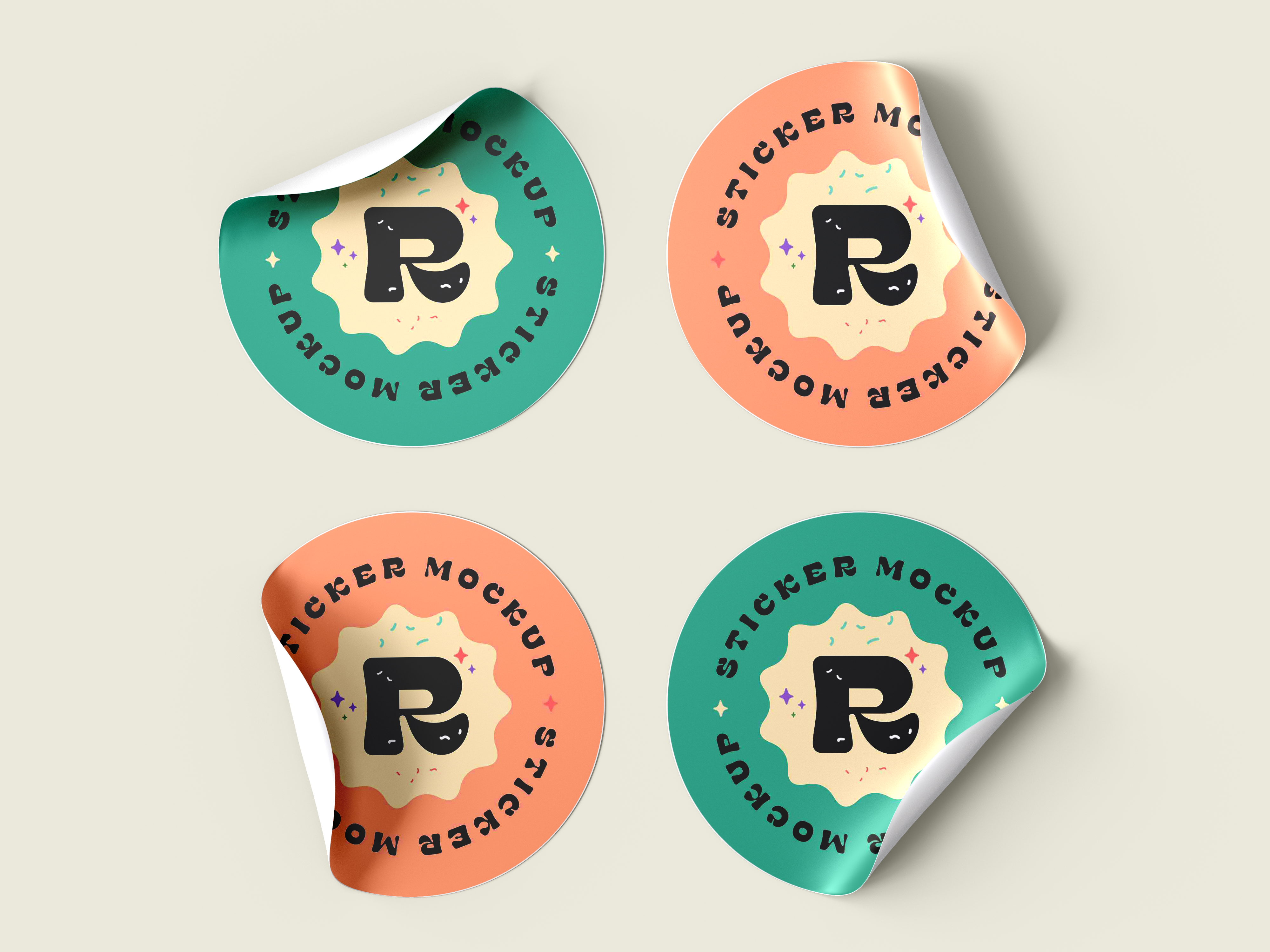 Four round stickers with a vintage design, featuring the letter "r" and the words "ranger natural" on a colored, scalloped badge template.