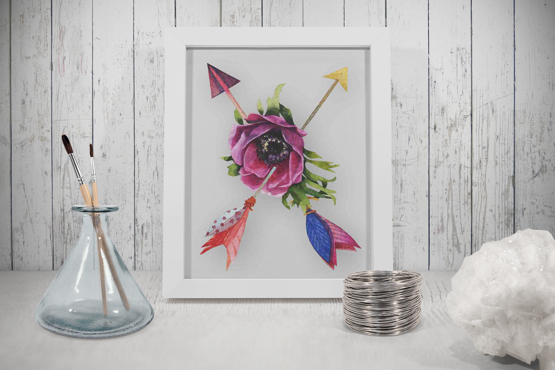 This mockup image features a white wooden frame showcasing a vibrant floral illustration with two arrows crossing behind it. The setting includes a rustic wood panel background, a glass vessel holding paintbrushes, and a stack of wire beside a crystal. This eye-catching design can be used for advertising artwork, home décor, or craft products. Use the mockup generator to create your design and share it on social media to reach a wider audience. Start crafting your unique visuals today!