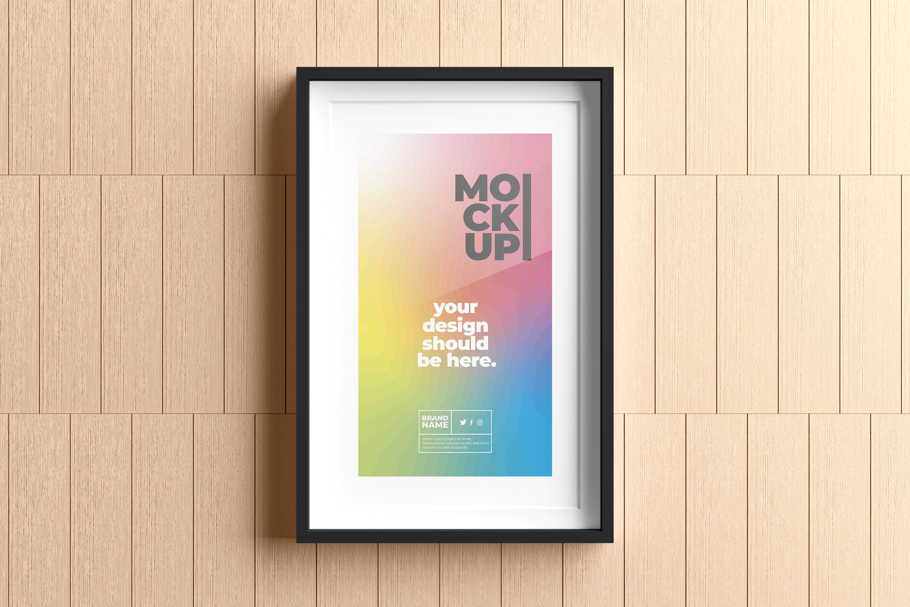 Framed poster on a wooden wall with a gradient background displaying the text "MOCKUP! Your design goes here, providing the perfect template for your creative ideas.