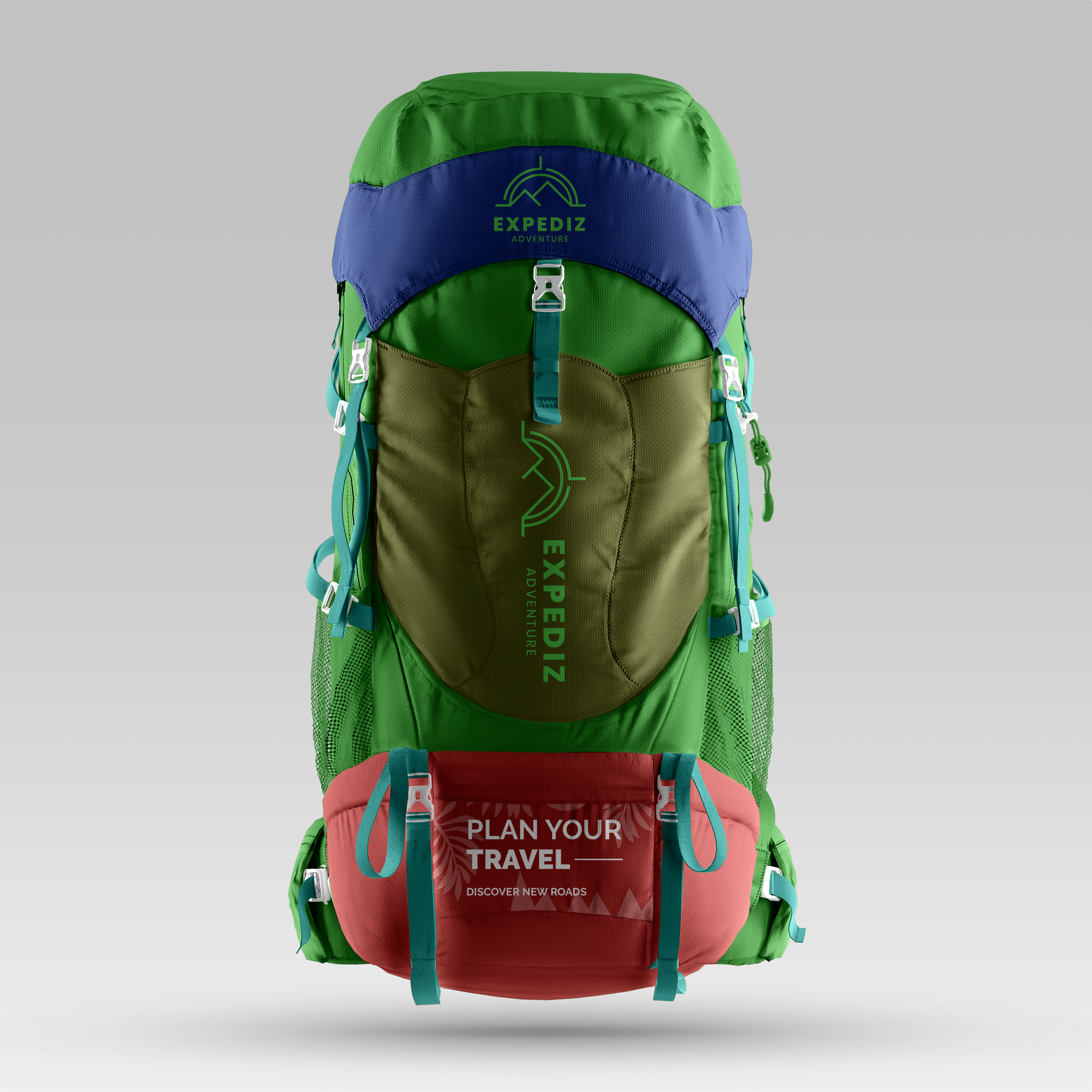 This mockup image showcases a vibrant hiking backpack prominently displayed against a plain, grey gradient background. The backpack features a green body with blue and red accents, multiple pockets, adjustable straps, and a top flap. It has an emblem on the front, adding to the adventurous design. This versatile mockup is ideal for advertising outdoor gear and travel essentials. Use our mockup generator to customize your design and share your creation on social media for maximum engagement!