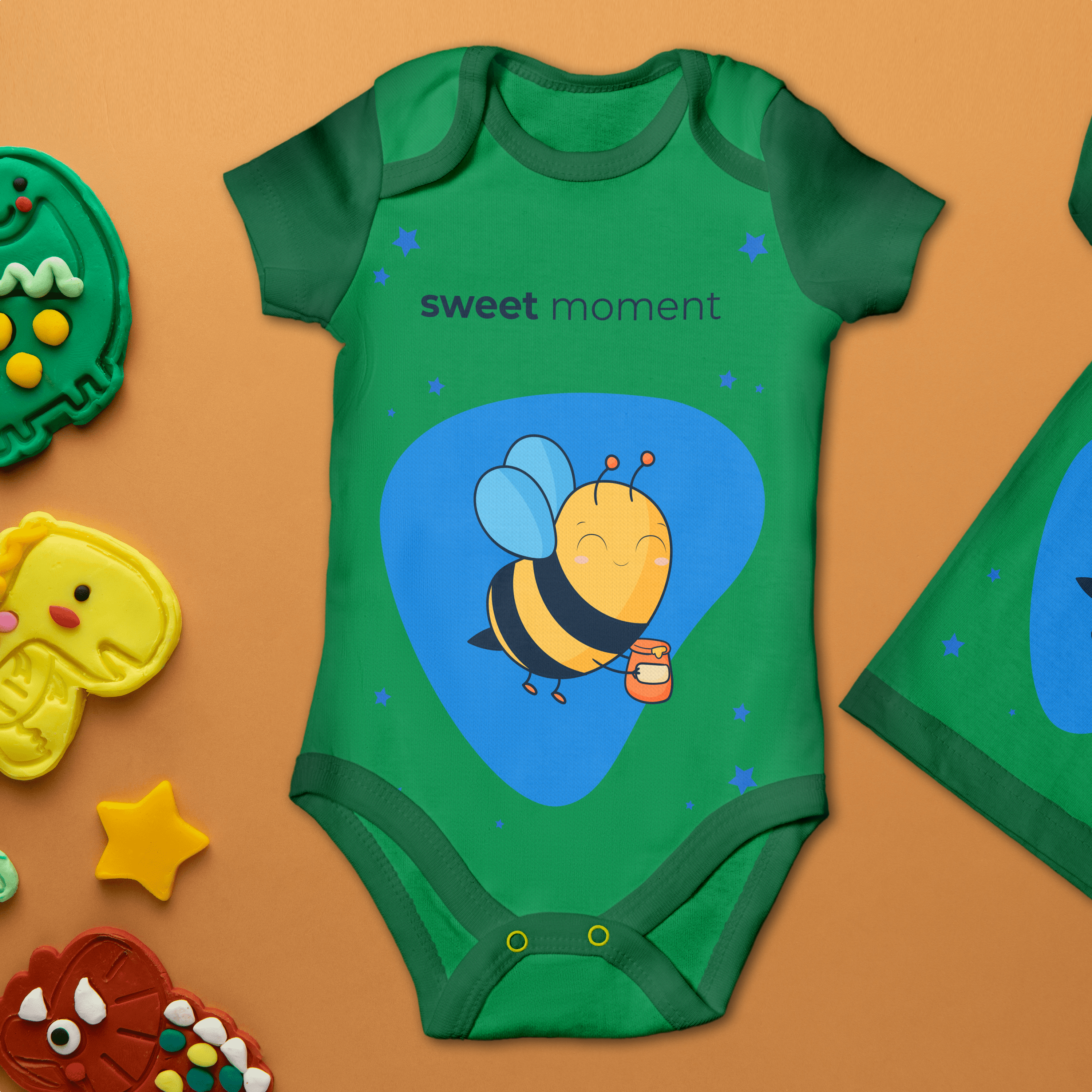 Green baby onesie mockup with a cartoon bee design surrounded by colorful cookies on an orange background.