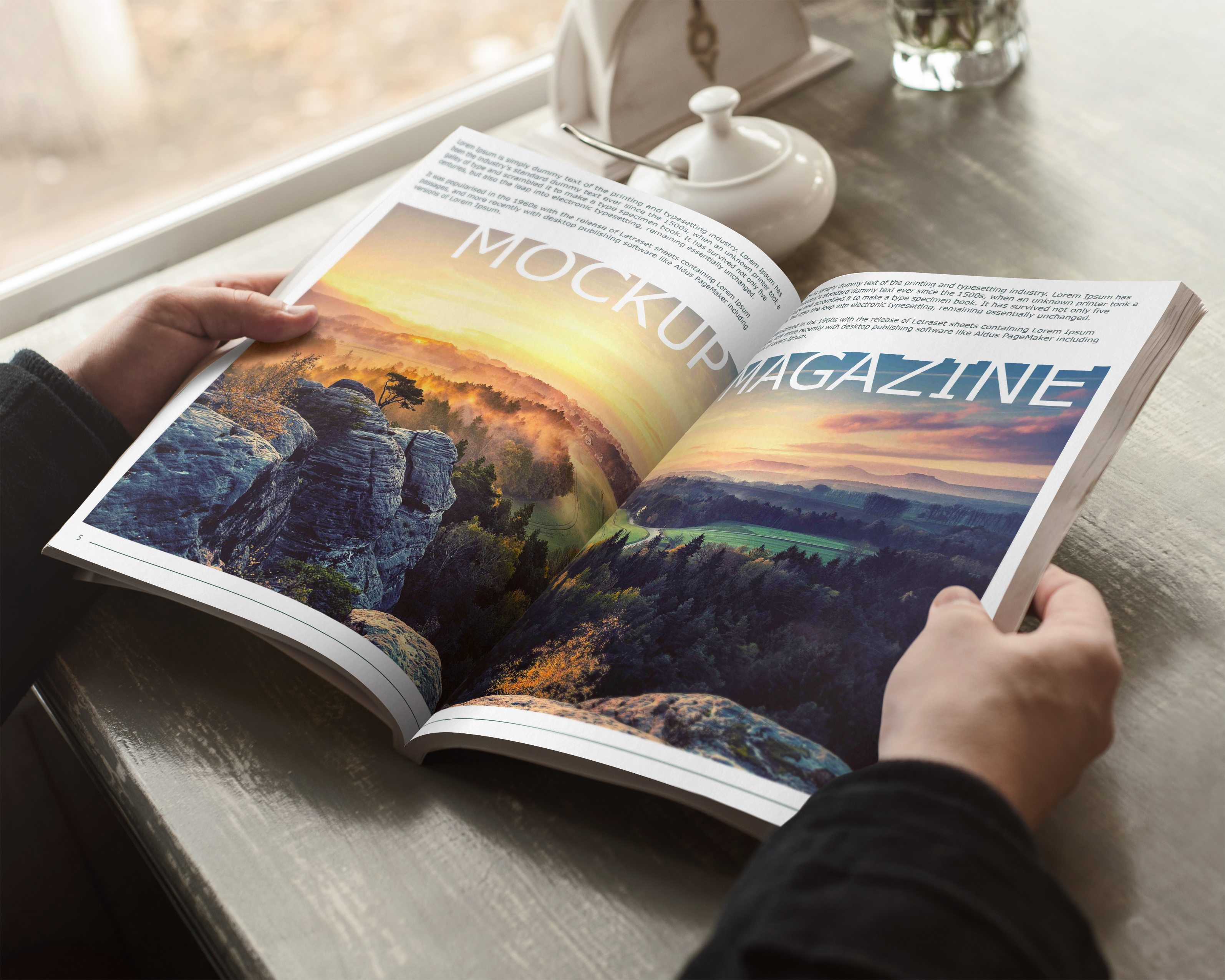 Hands holding an open magazine with a mockup of a landscape photo on the page, by a window with natural light.