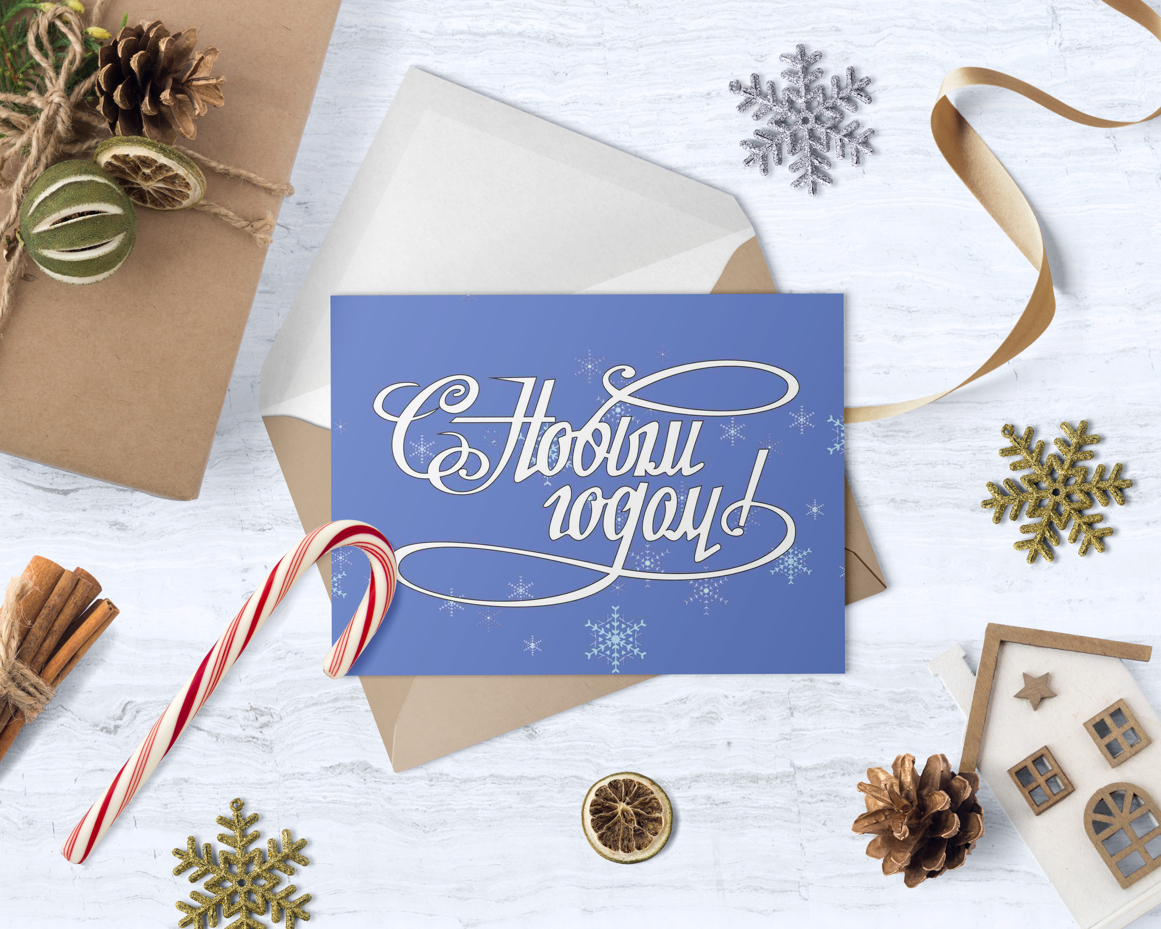 Holiday-themed flat lay template with gifts, a blue card reading "с новым годом", snowflakes, a candy cane, and winter decorations on a wooden surface.