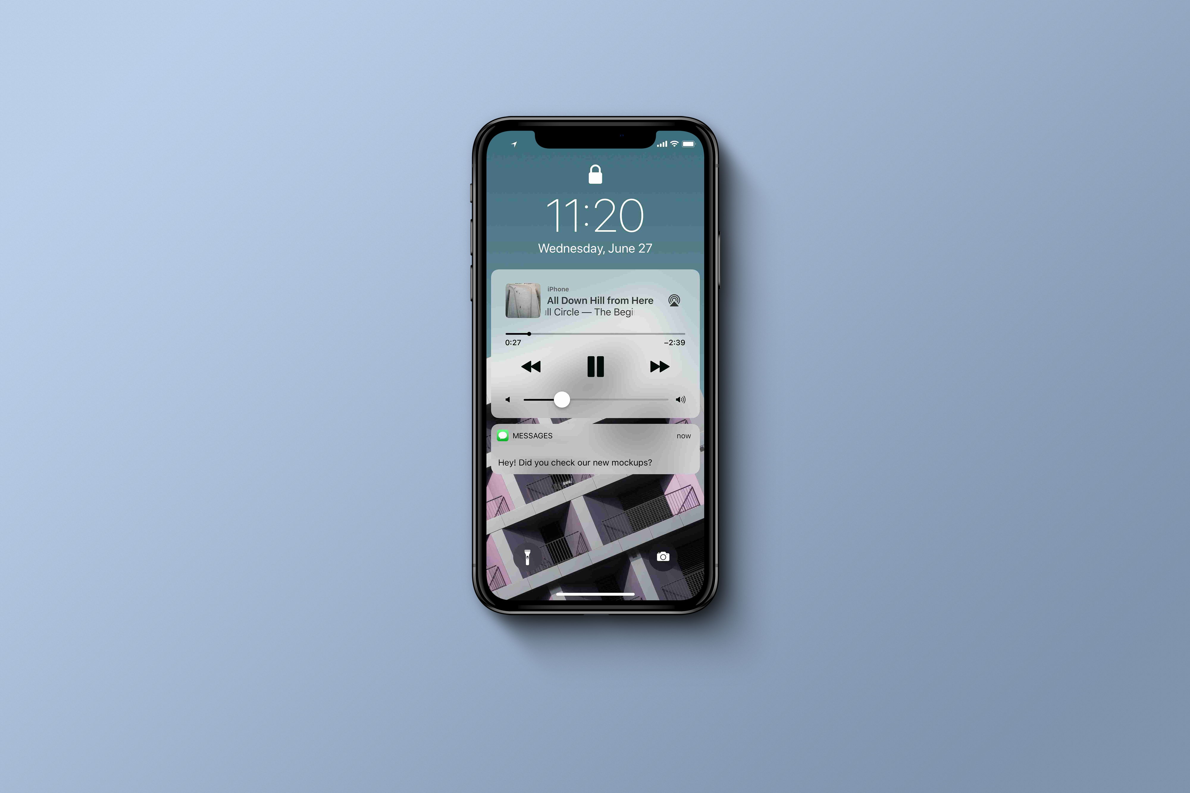 The mockup image features a smartphone with a sleek black frame, displayed against a subtle, light blue gradient background. The device exhibits a realistic lock screen with time, date, and notification elements, alongside a music player interface. This high-resolution, clean design makes it ideal for showcasing app designs or mobile UI concepts. Use this mockup to elevate your advertising by visualizing your app on a popular device. Try our mockup generator today and share your stunning design on social media!