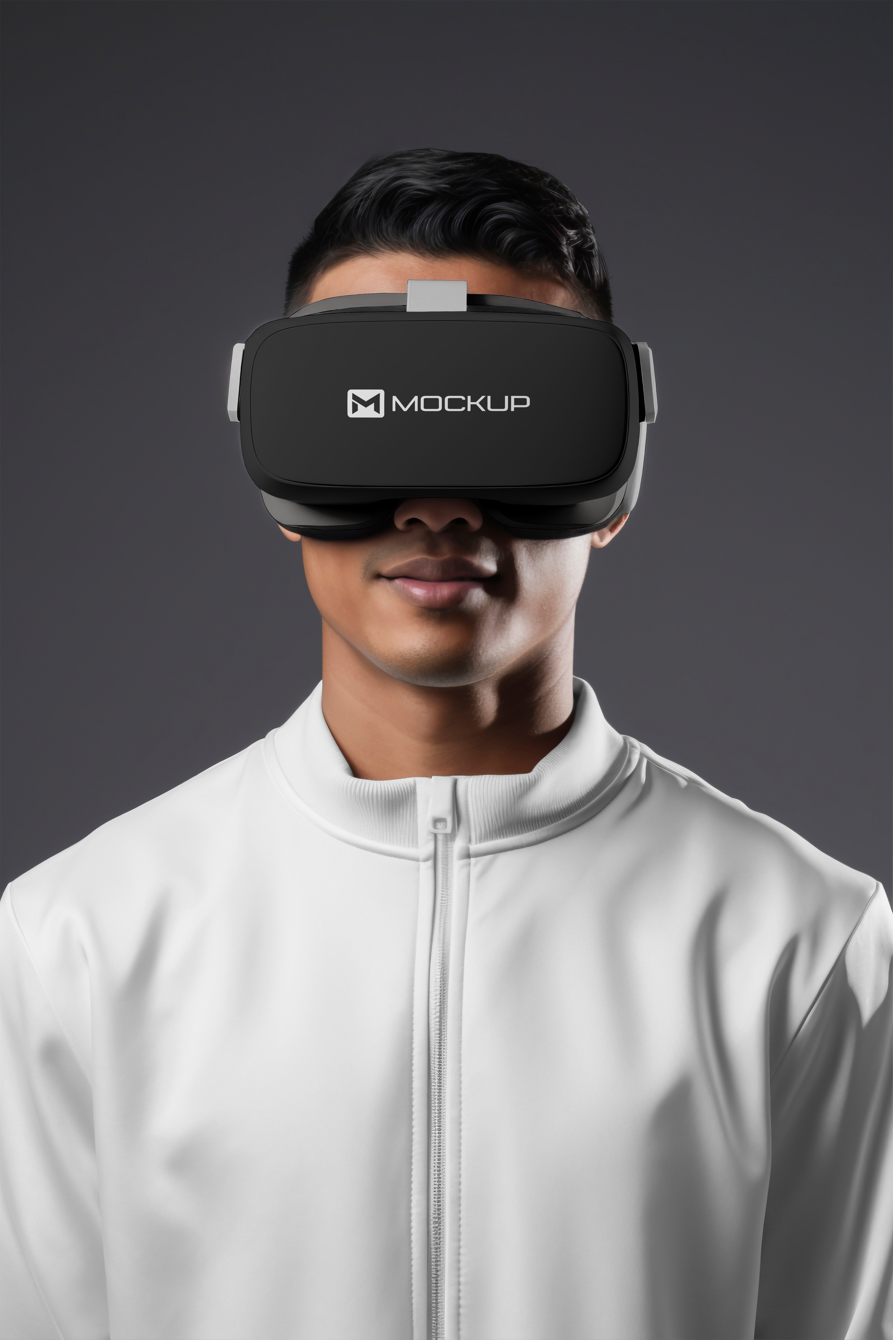 Man wearing a virtual reality headset against a gray background, serving as a perfect mockup.