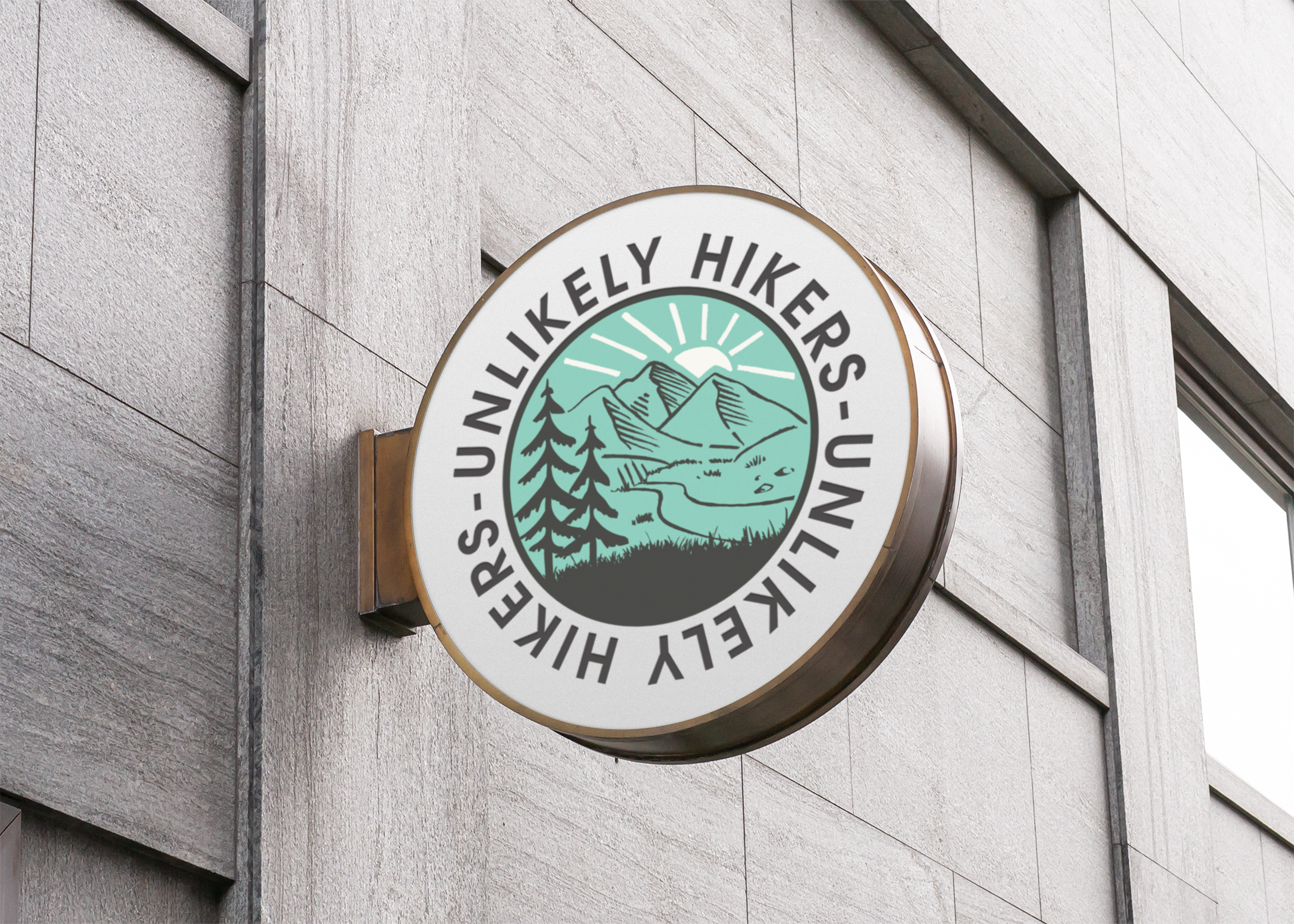 Mockup of a round sign with the logo "unlikely hikers" mounted on a building wall, featuring a mountain and trees design within a circle.