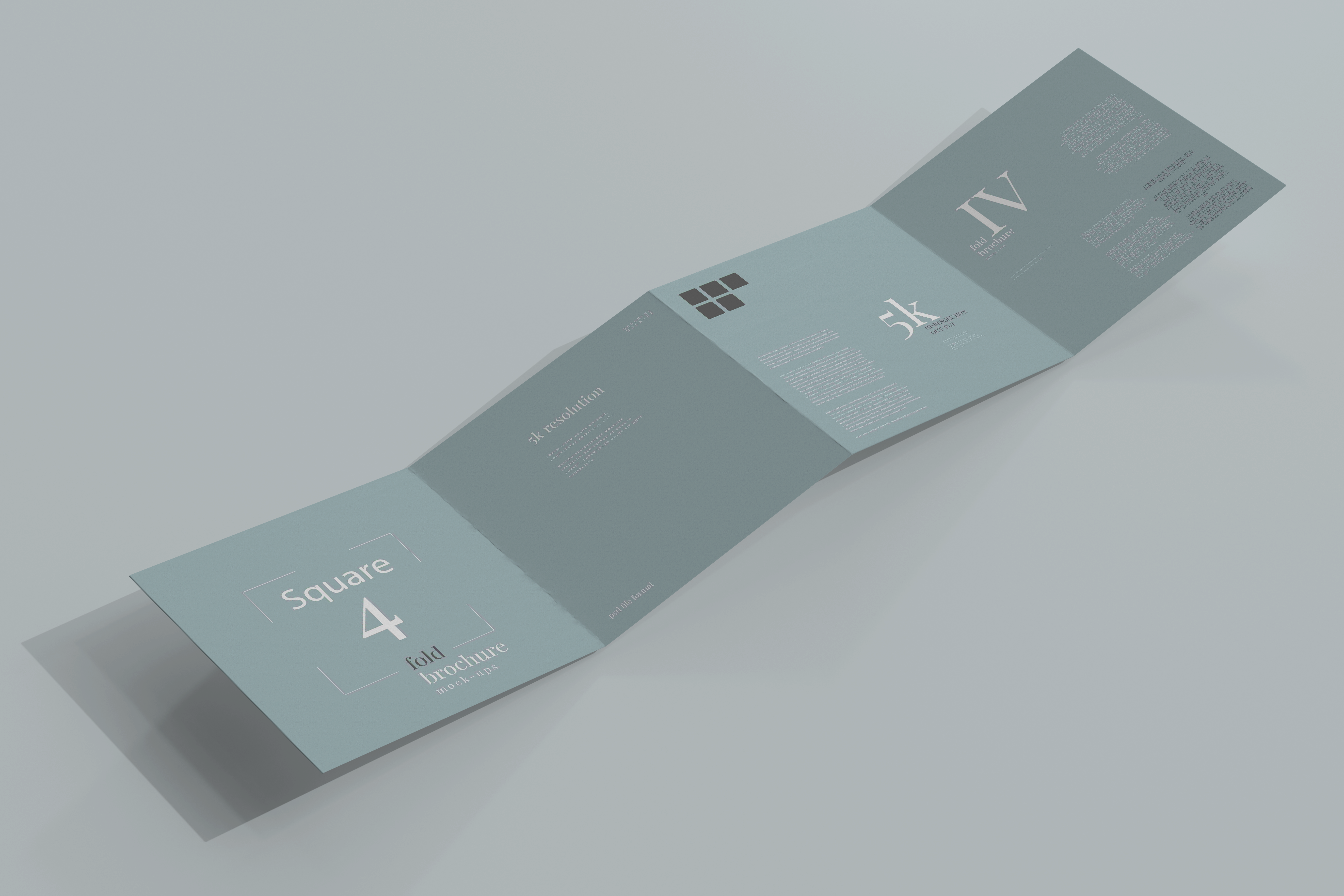 The mockup image features a square brochure with four folds, set against a minimalist light grey background. The brochure, opened flat, showcases a subtle, professional design with clean lines and sections for text and graphics. The elegant, soft colors and ample white space create a sophisticated visual appeal. Use this mockup for advertising by customizing it with your brand’s logo, colors, and content. Generate your unique design now and share it on social media to captivate your audience.