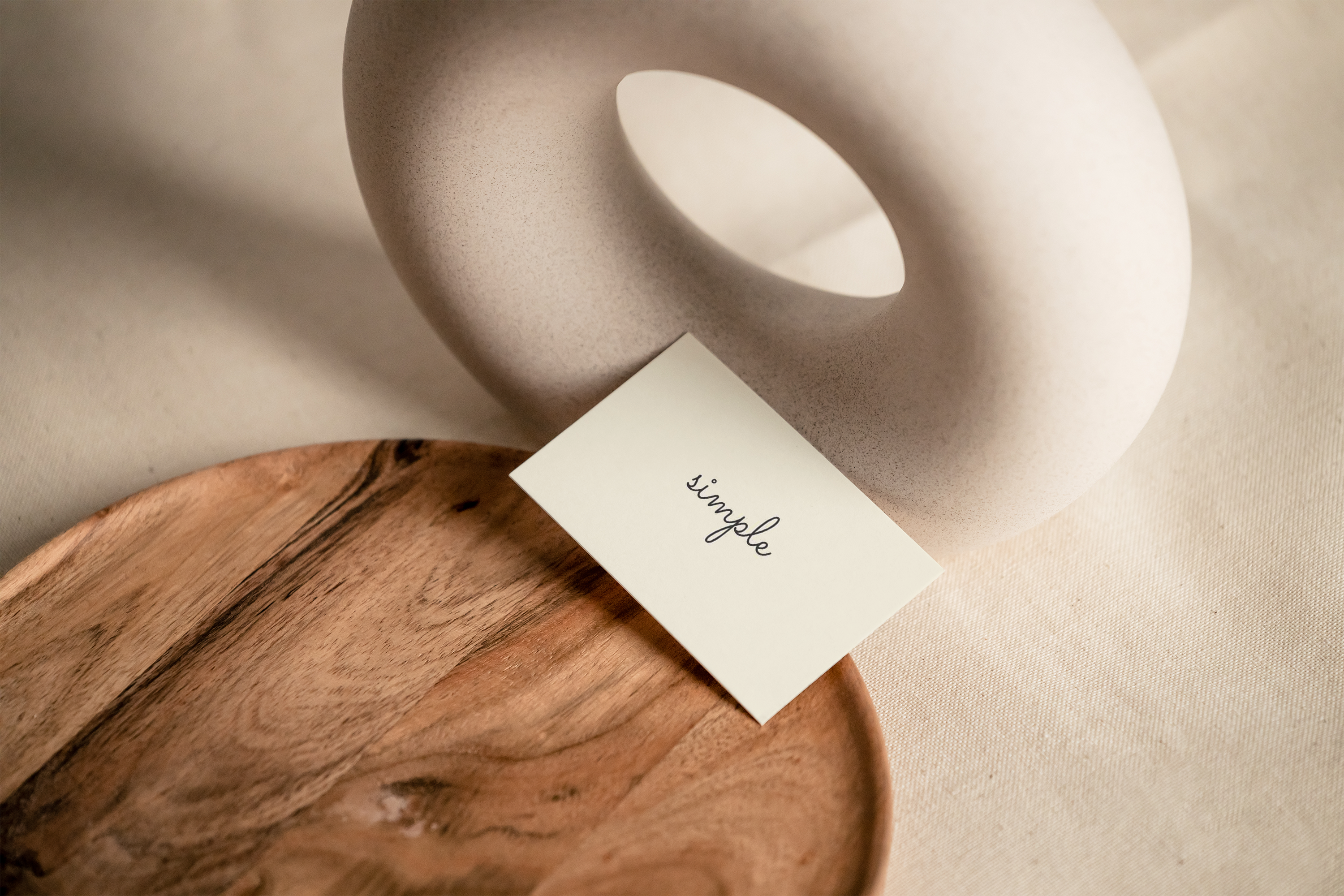 The mockup image showcases a minimalist setting with a soft, neutral-toned background. The central object is a beautifully textured light-toned ceramic ring sculpture. A small card rests on a rustic wooden plate, offering a touch of elegance. The design elements are simple yet sophisticated, making it ideal for advertising high-end products or services. Use this mockup generator to create eye-catching promotional material and share your stunning designs on social media to captivate your audience!