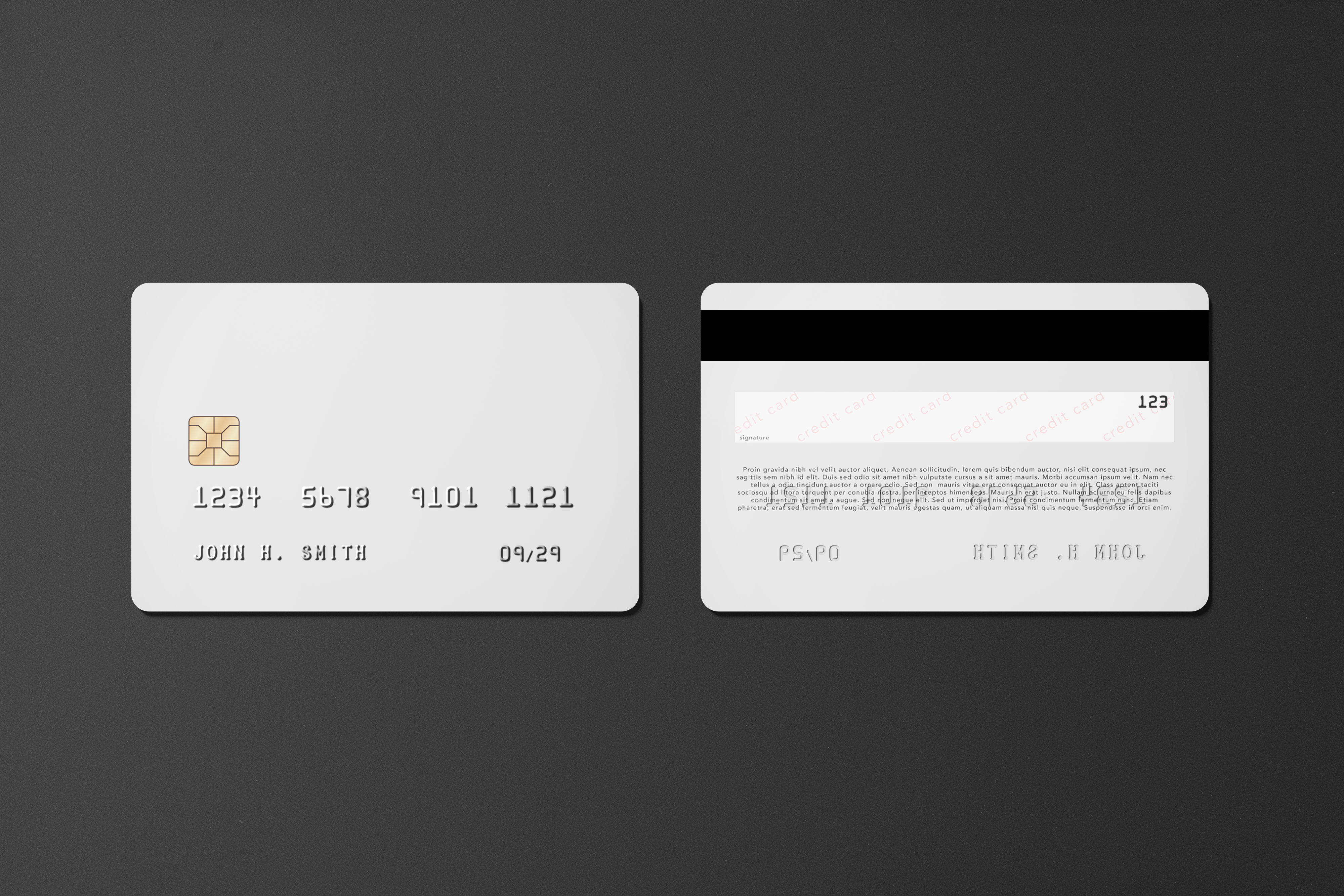 The mockup image showcases the front and back view of a modern white plastic credit card on a sleek dark gray background. The card features an embedded chip, a series of embossed numbers, and a name on the front, and a magnetic strip with security details on the back. This mockup is perfect for advertising new credit card designs, loyalty programs, or banking services. Leverage this mockup generator to visualize your designs and share your creations on social media.