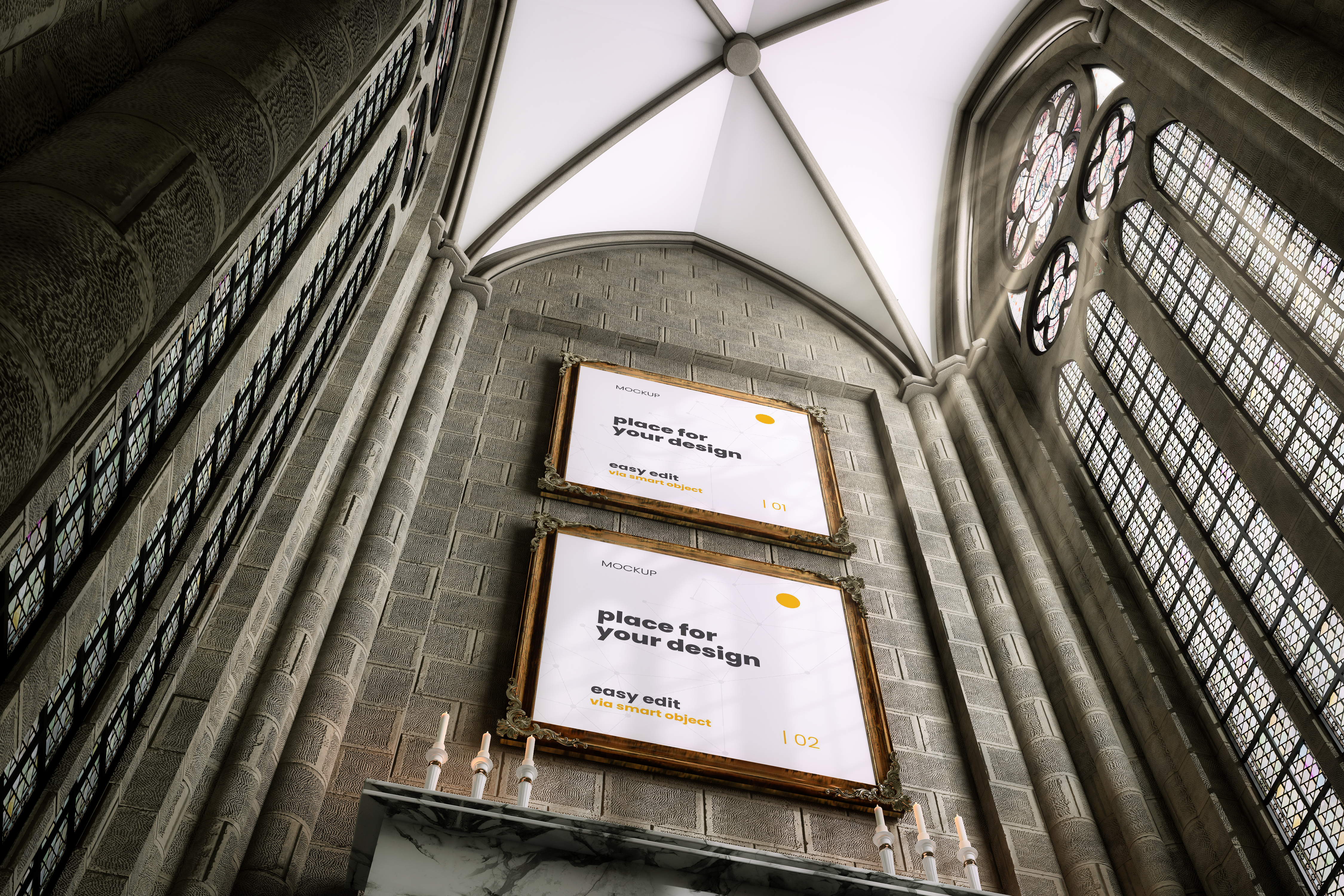 The mockup features two framed posters displayed on a grand, gothic stone wall within an ornate architectural setting. Stained glass windows and vaulted ceilings enhance the sophisticated ambiance. The main objects, two posters, are elegantly framed with gold and offer ample space for custom design. This mockup is perfect for high-end advertising campaigns, adding a touch of elegance to any promotional material. Use the mockup generator now to create stunning designs and share your artwork on social media for maximum impact!