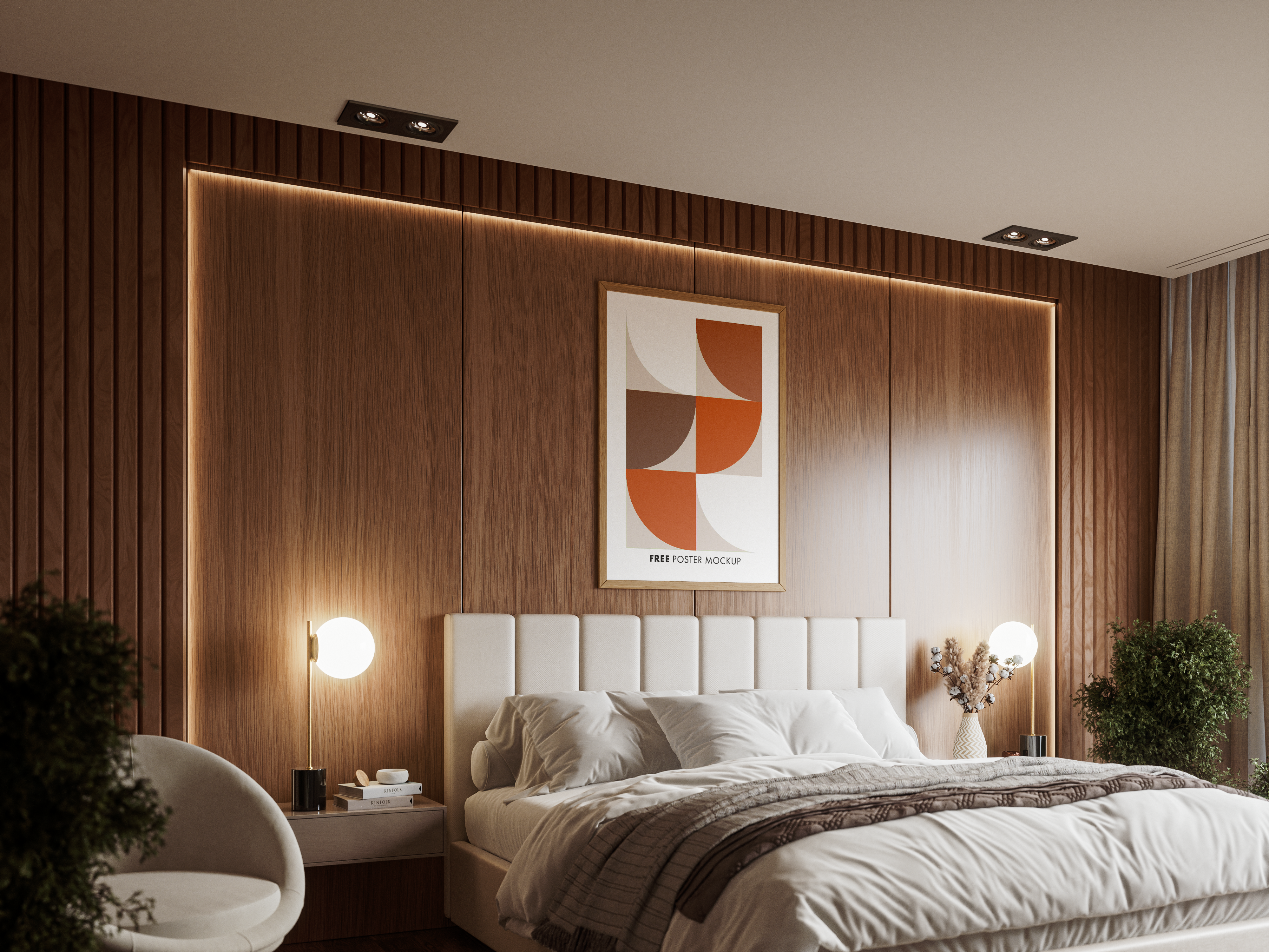 This mockup image showcases a modern bedroom setting with a cozy, well-lit backdrop. The main object is a framed poster featuring geometric shapes in orange and grey, mounted above a plush bed with white bedding. Wooden wall paneling, ambient lighting, and minimalist decor, including round bedside lamps and plants, create a warm atmosphere. Use this mockup to highlight stylish art prints or posters in a contemporary home setting. Try our mockup generator and share your distinctive designs on social media!