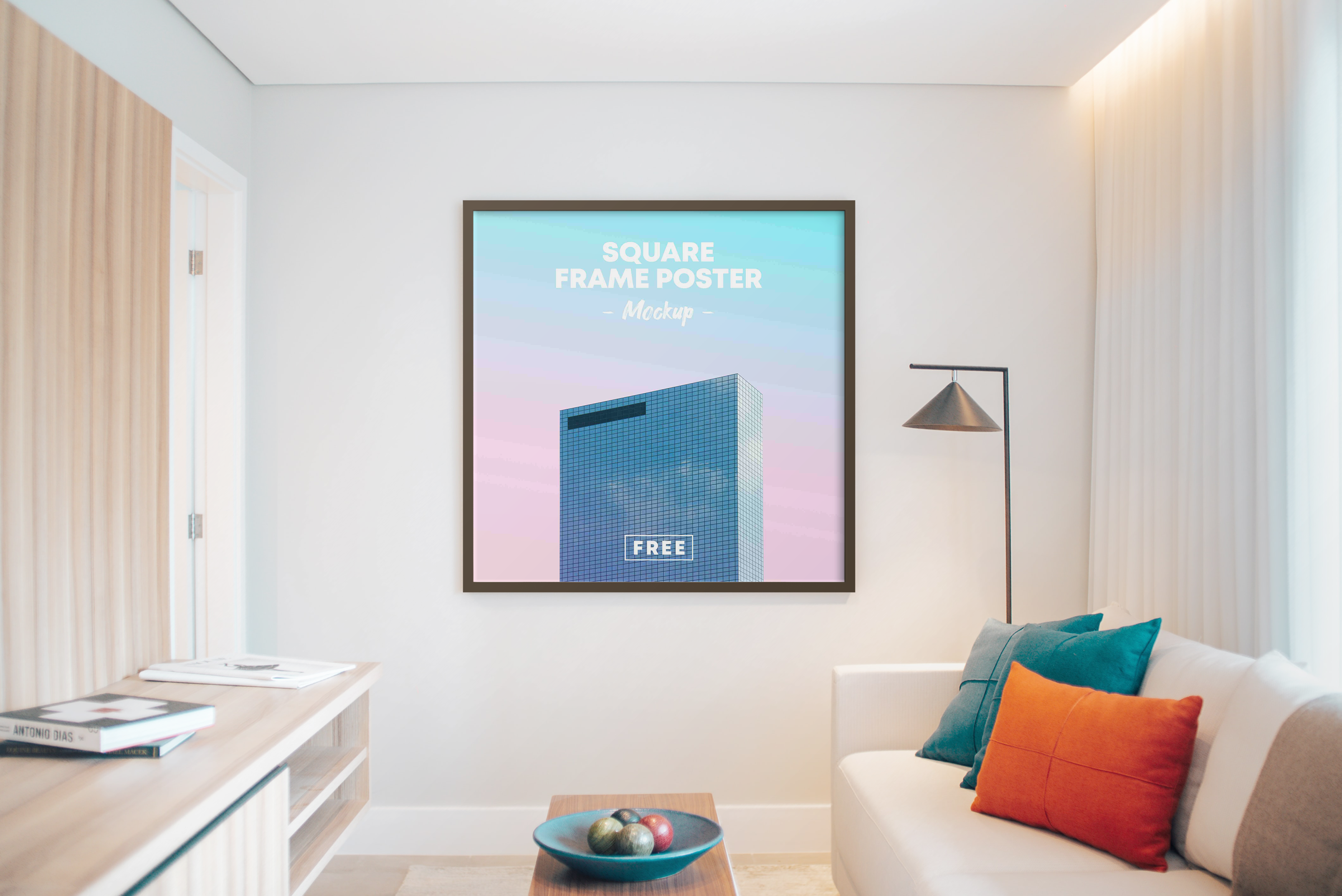 The mockup showcases a stylish, square-framed poster hung on the wall of a modern living room. The setting features a cozy white sofa adorned with vibrant blue and orange cushions, a wooden coffee table with a bowl of decorative items, and a floor lamp. The background includes light-colored walls and a wooden storage unit. Utilize this mockup to advertise your design in a home decor context. Try our mockup generator and share your stunning design on social media today!