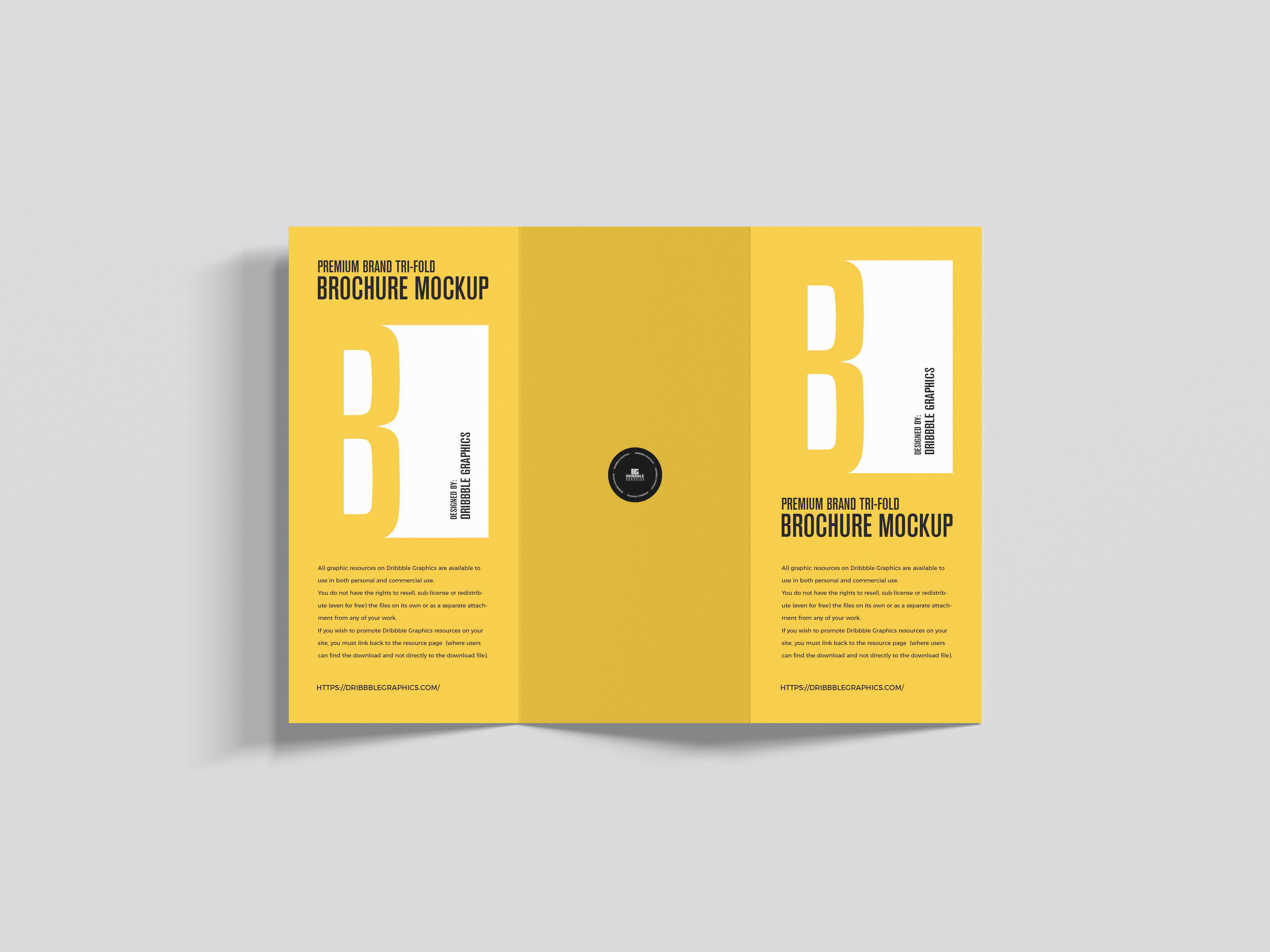 This mockup image features a tri-fold brochure with a sleek, modern design, set against a plain, light grey background. The brochure showcases a vibrant yellow color and large "B" design elements in white. The layout is clean and eye-catching, perfect for advertising purposes. Use this mockup to visualize and present your brochure designs professionally. Create stunning promotional materials and share them effortlessly on social media. Try the mockup generator now and let your designs stand out!