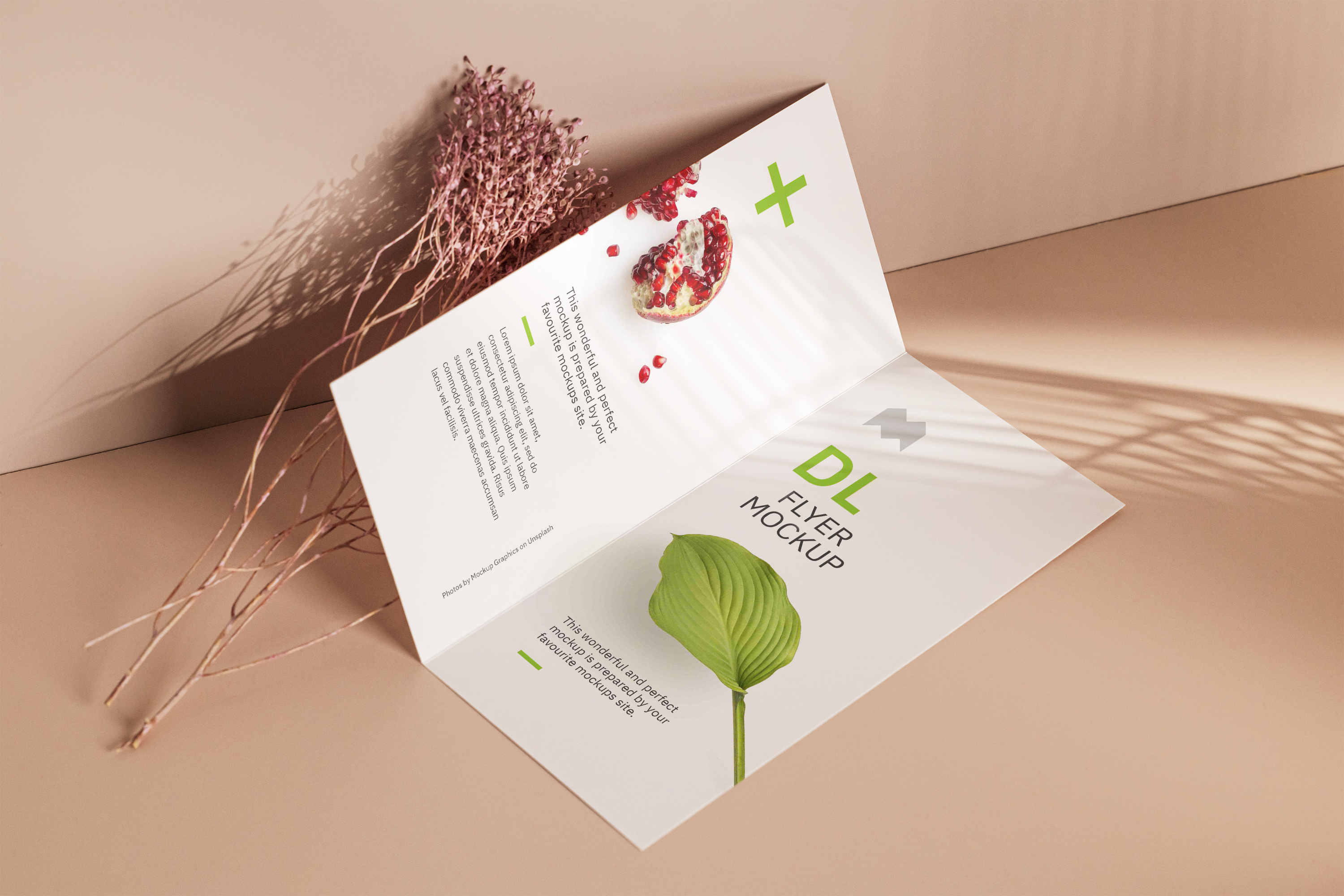 The mockup image features a minimalist and elegant setting with a soft beige background. The main object is a half-folded DL flyer showcasing a clean, modern design with bright green highlights and nature-inspired elements, including a leaf and a garnished dessert. A dry floral arrangement adds a touch of sophistication. Ideal for advertising, this mockup can beautifully present your design ideas. Use the mockup generator now and share your stunning designs on social media to captivate your audience!