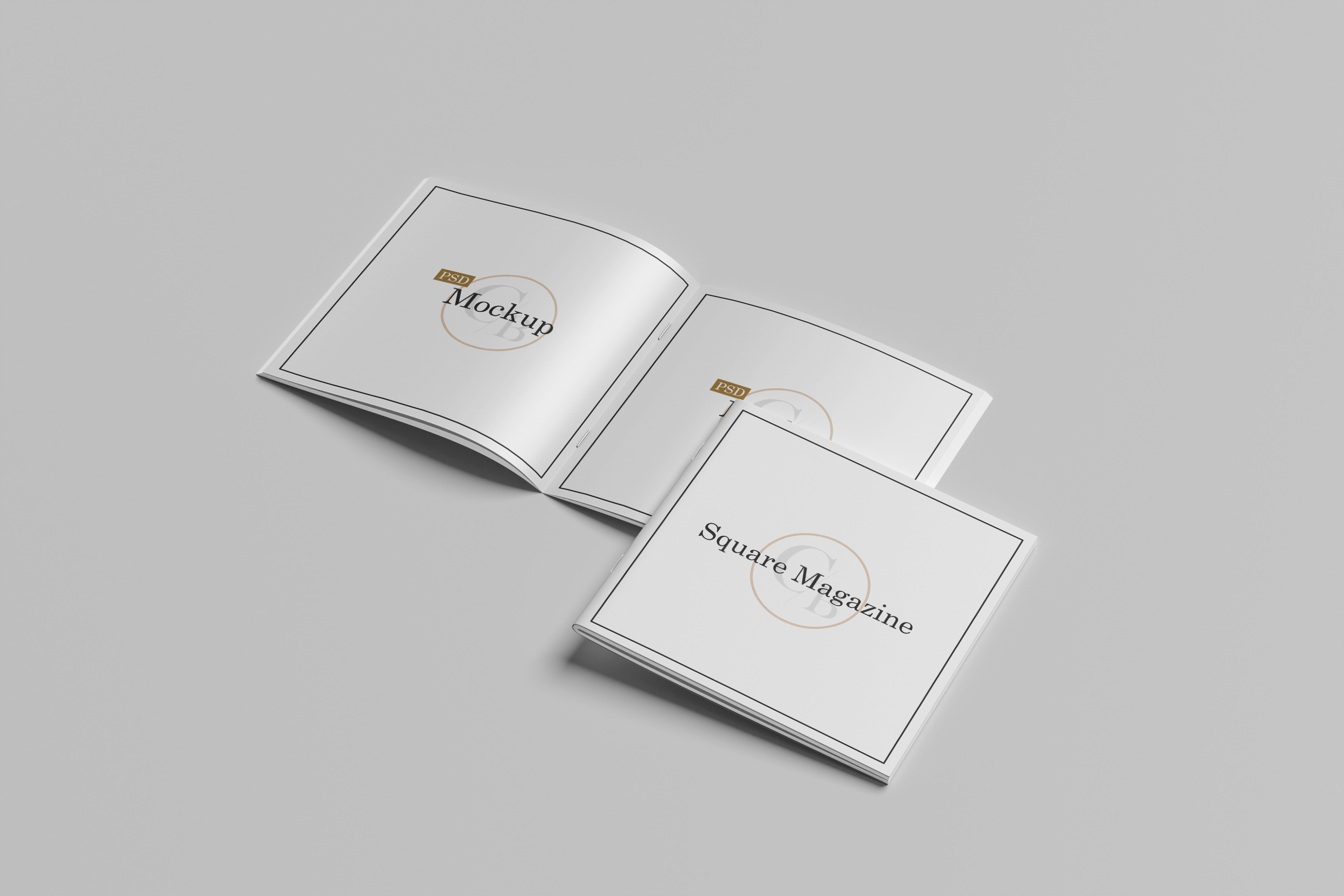 This mockup image features a trio of square magazines displayed on a clean, minimalist grey background. The main object is an open magazine, showcasing neatly arranged pages with a simple, elegant design. The cover of another magazine is partially visible, emphasizing the professional layout. Utilize this mockup for advertising by inserting your design to portray a polished, realistic presentation. Explore the mockup generator now and share your uniquely crafted design on social media to captivate your audience!