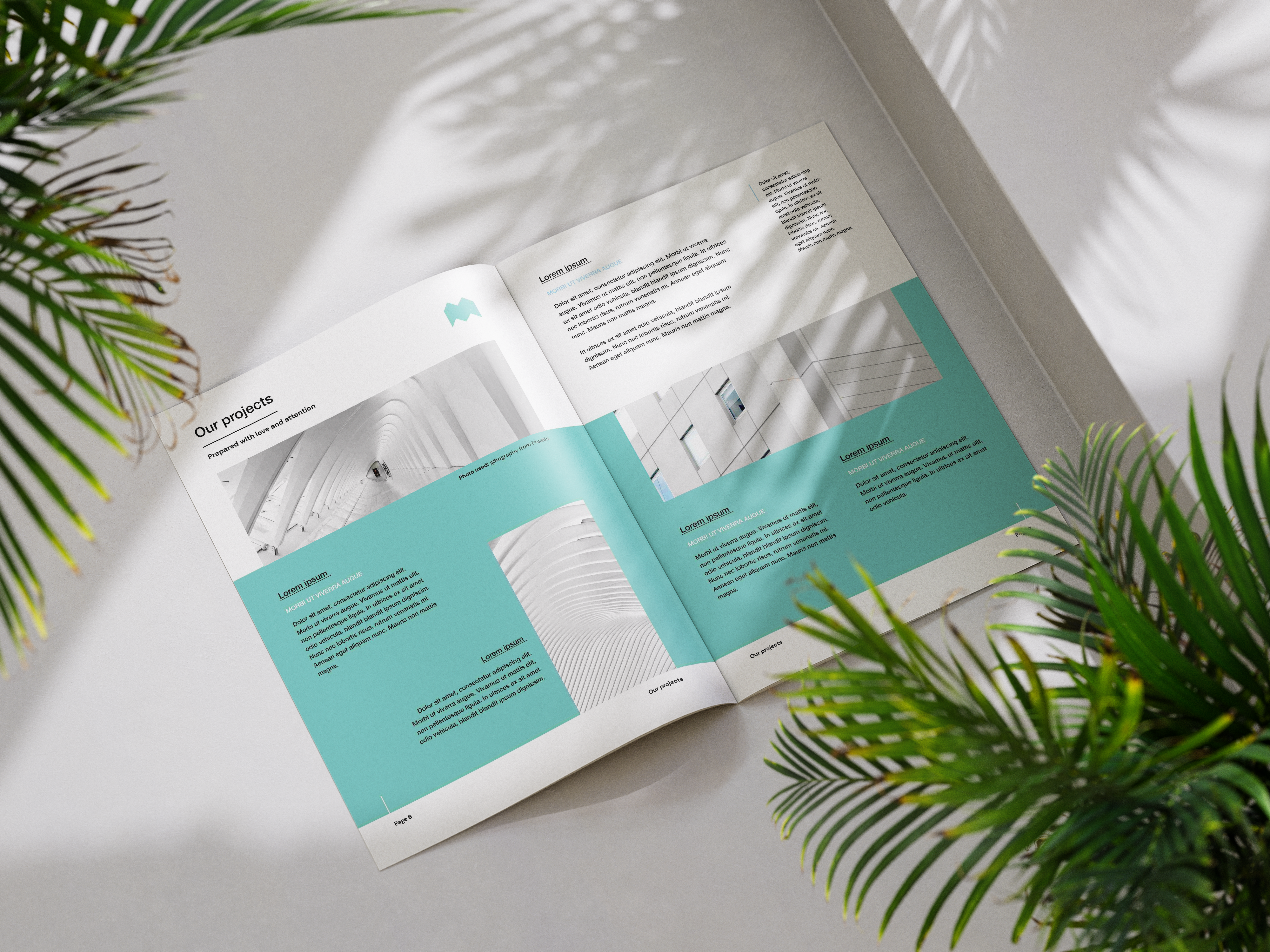 The mockup image displays an open magazine, set against a bright, minimalist background with soft shadows of palm leaves. The main object is the magazine, featuring clean, modern design elements with ample white space and sections highlighted in a light teal color. The layout includes images and blocks of text, perfect for showcasing creative content. This mockup is ideal for advertising latest projects or offerings. Use our mockup generator to create your own stunning designs and share them on social media for maximum engagement!