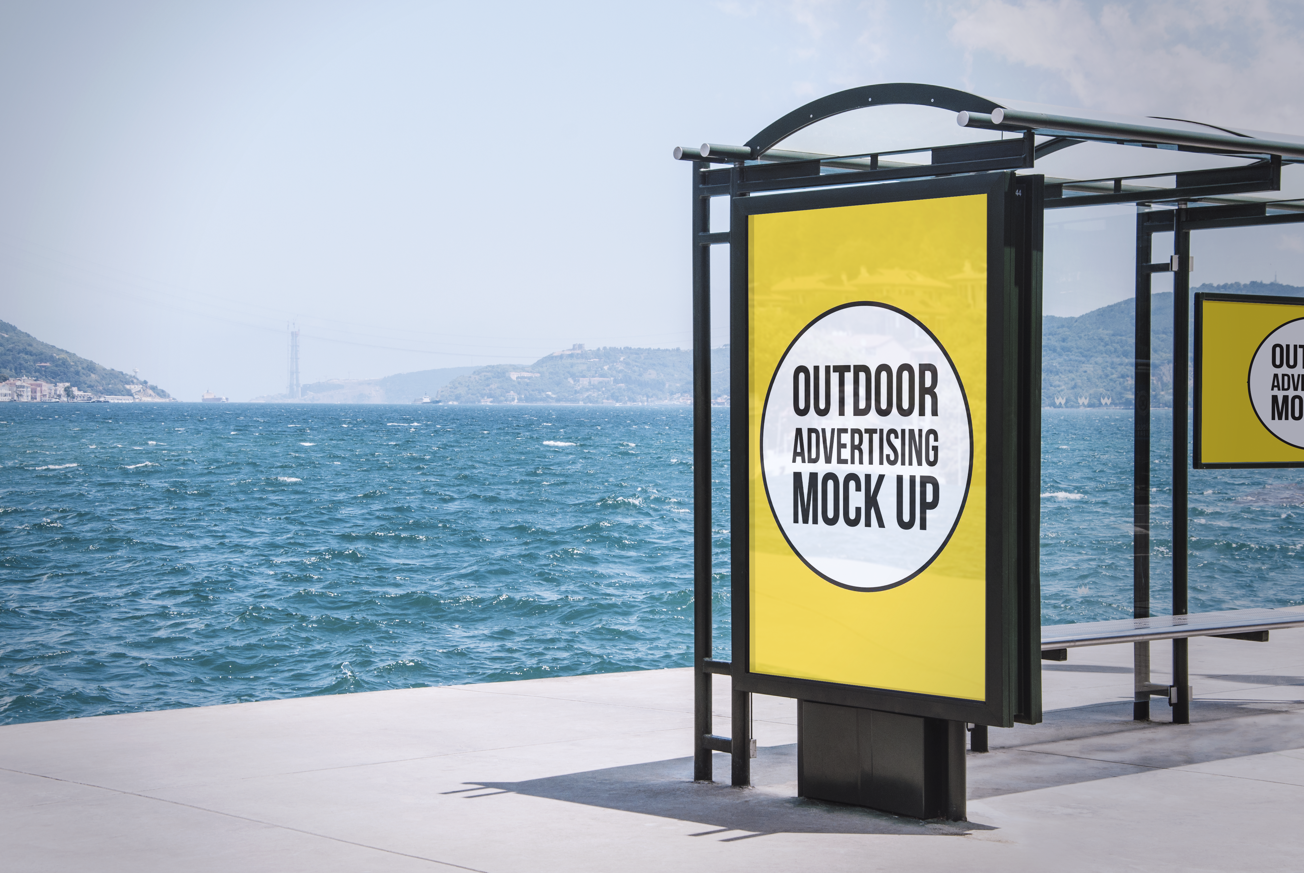 The mockup image features a bus stop by the seaside, with a picturesque background of blue water and hilly terrain. The main object is an outdoor advertising display with a bright yellow background, bordered in black, highlighting a central white circle. This design is eye-catching and vibrant, perfect for attracting attention. Use this mockup for showcasing your advertisements in a realistic and engaging setting. Try our mockup generator now and share your stunning designs on social media!