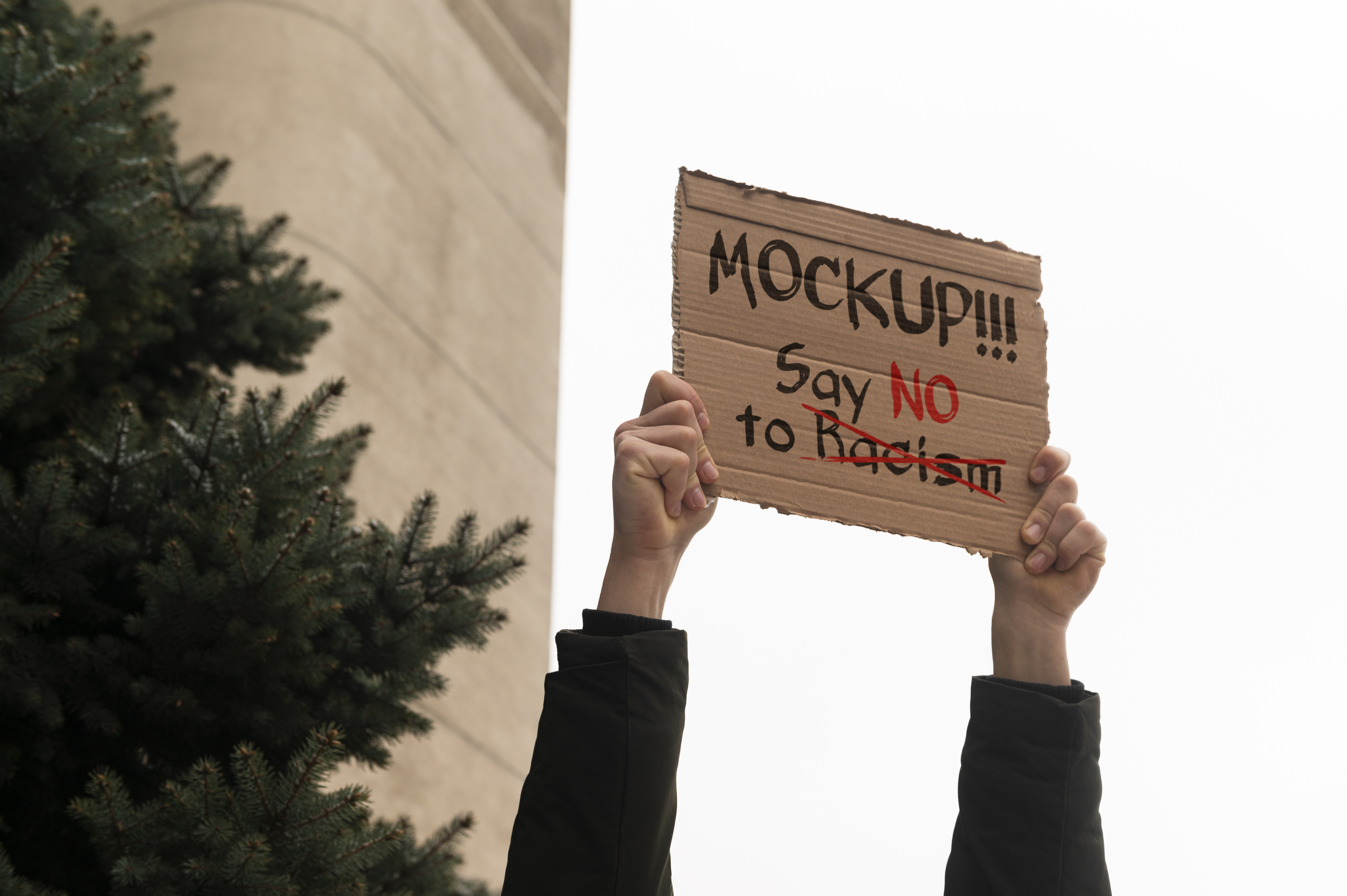 Person holding a protest template that reads "mockup!! say no to injustice.