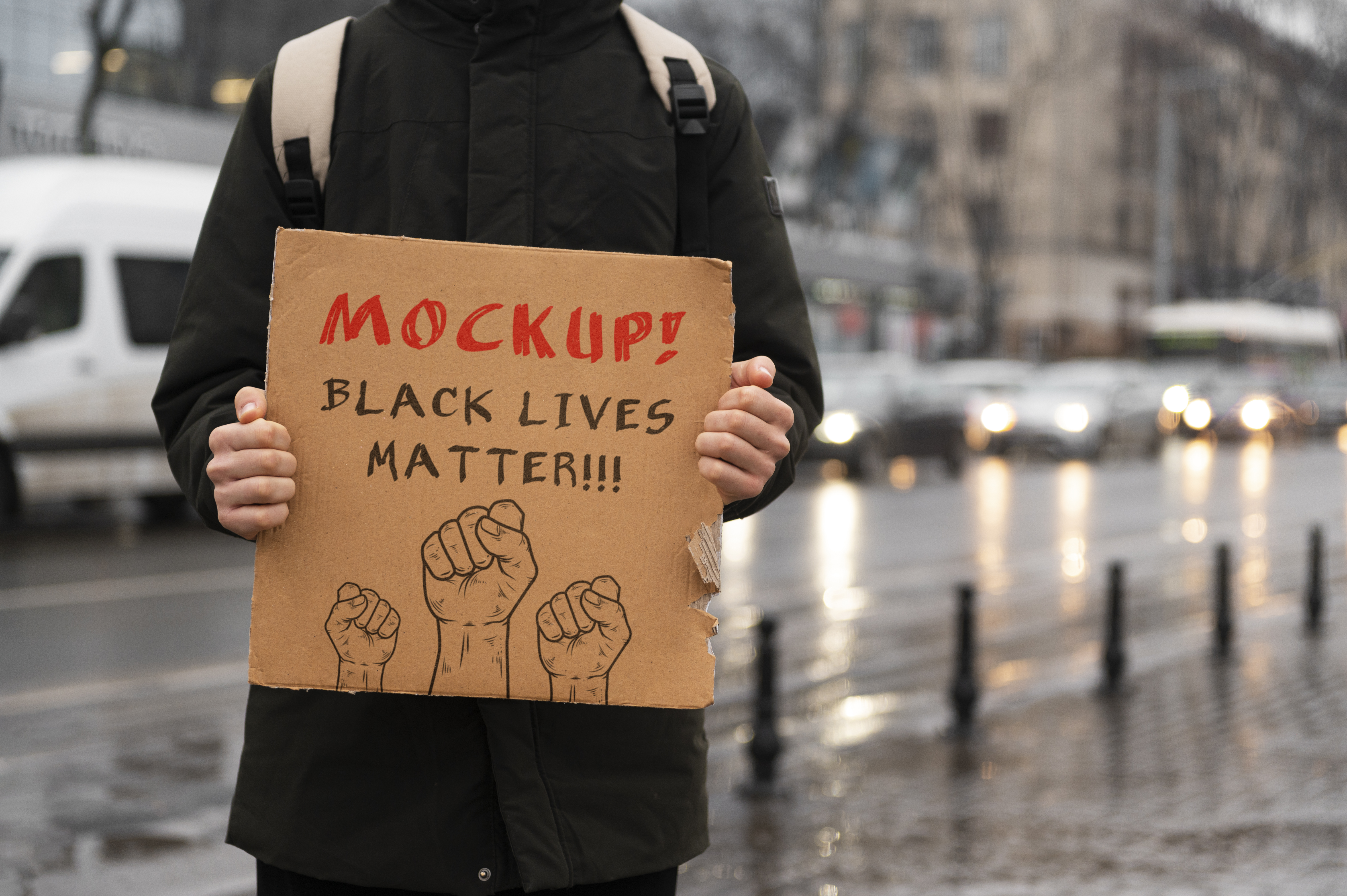 The image features a person holding a cardboard sign in an urban setting with a wet street and buildings blurred in the background. The cardboard sign, prominently displayed, has bold hand-drawn text and images of raised fists symbolizing resistance and solidarity. This mockup can be used for advertising by customizing the message on the sign to promote your cause or business. Use our mockup generator to create your own impactful design and share it on social media to spread your message!