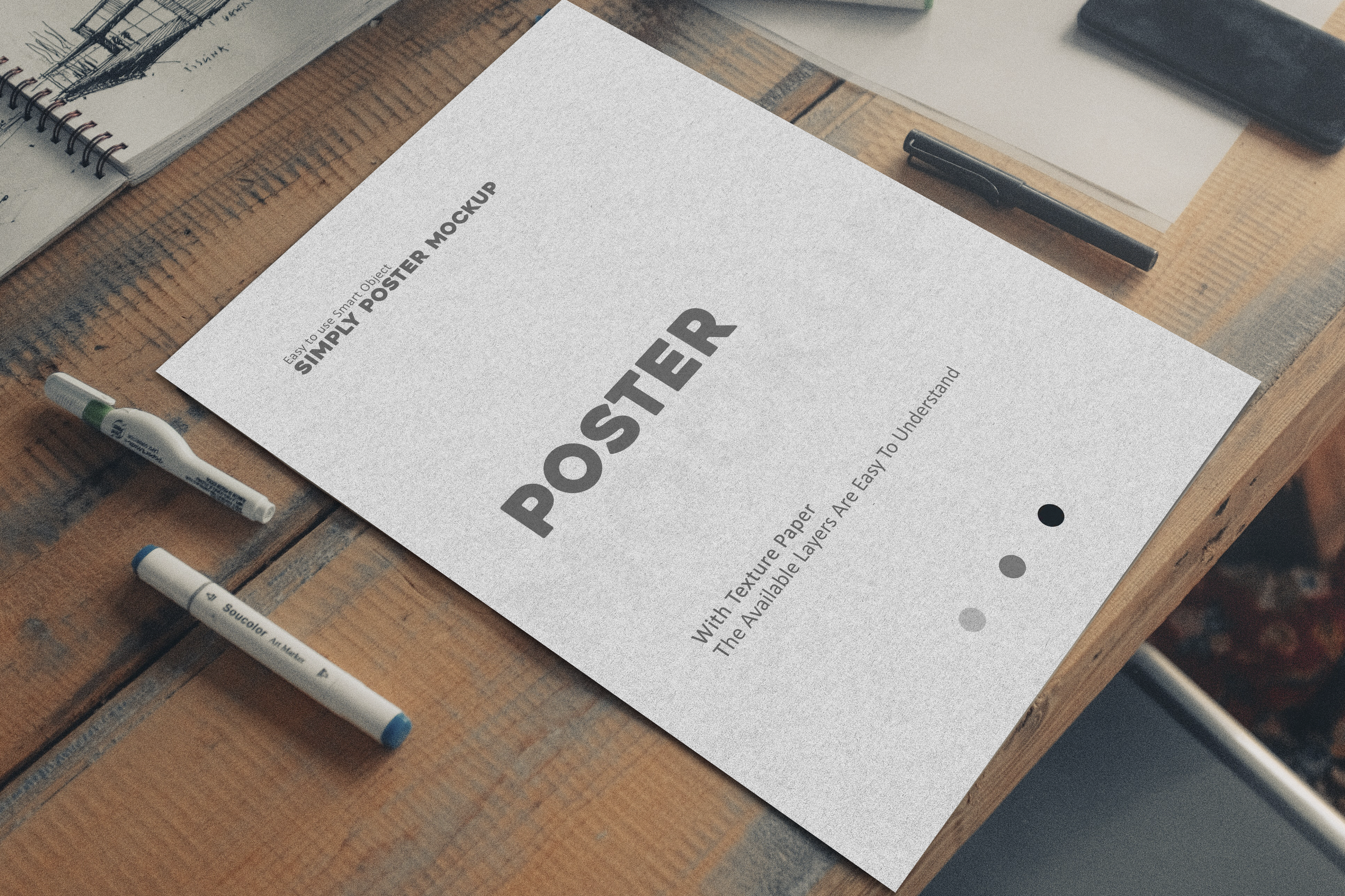 This mockup image features a poster on a rustic wooden desk with various art supplies and a notebook nearby, creating an artistic setting. The main object is a poster with a textured paper surface displaying modern design elements like circles and minimalist text layouts. Utilize this mockup to showcase your advertising designs in a realistic environment, enhancing visual appeal. Use the mockup generator to create striking designs and share them on social media to attract attention and engagement.