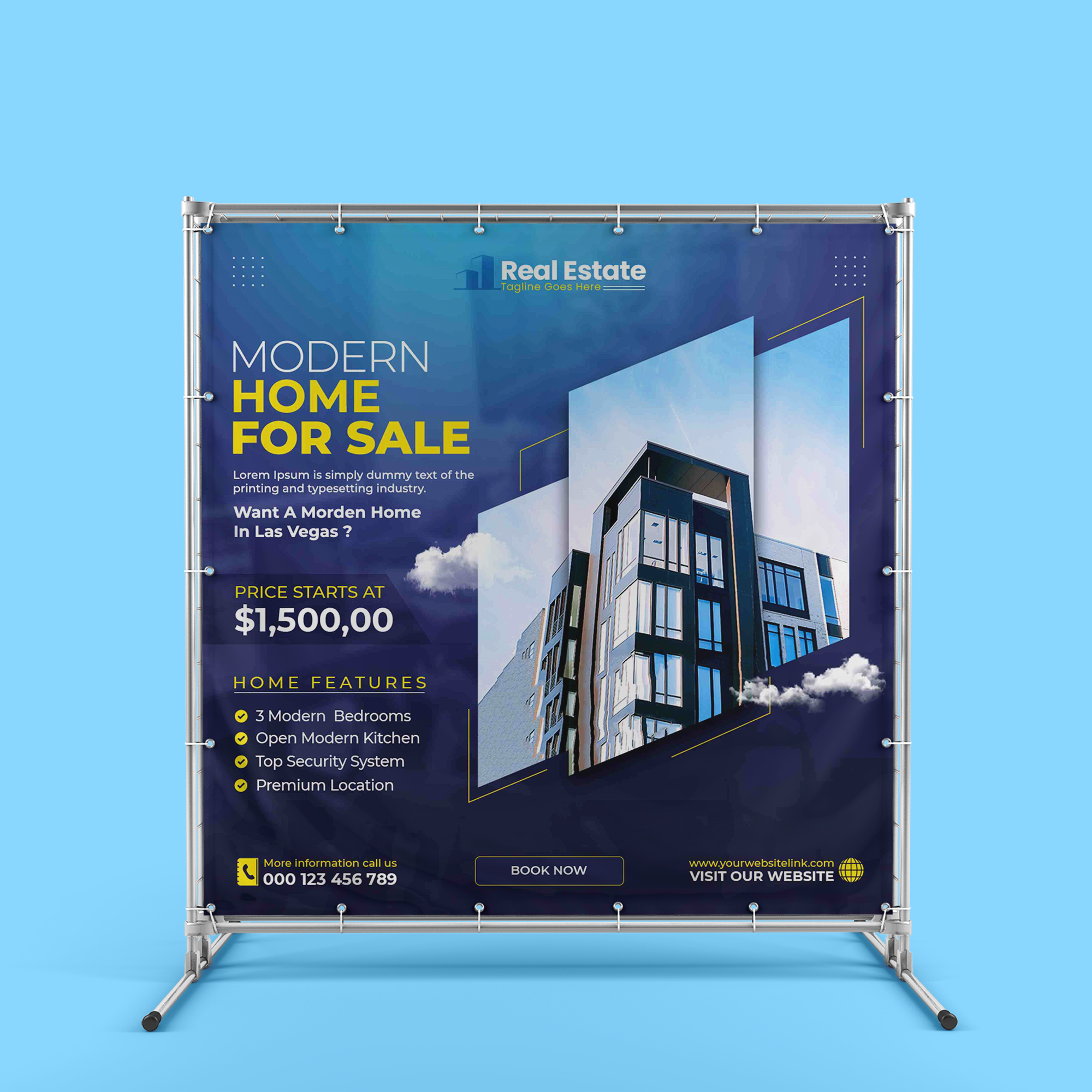 This mockup features a promotional banner set against a solid blue background, with a metallic frame holding the banner in place. The main object is an advertisement for a modern real estate property, showcasing a sleek, contemporary building design with large glass windows and clean architectural lines. Visually appealing elements include icons and a price tag, highlighting property features like bedrooms and kitchen amenities. Utilize this mockup for impactful real estate advertising, and create engaging content for social media. Use the mockup generator now and share your design online!