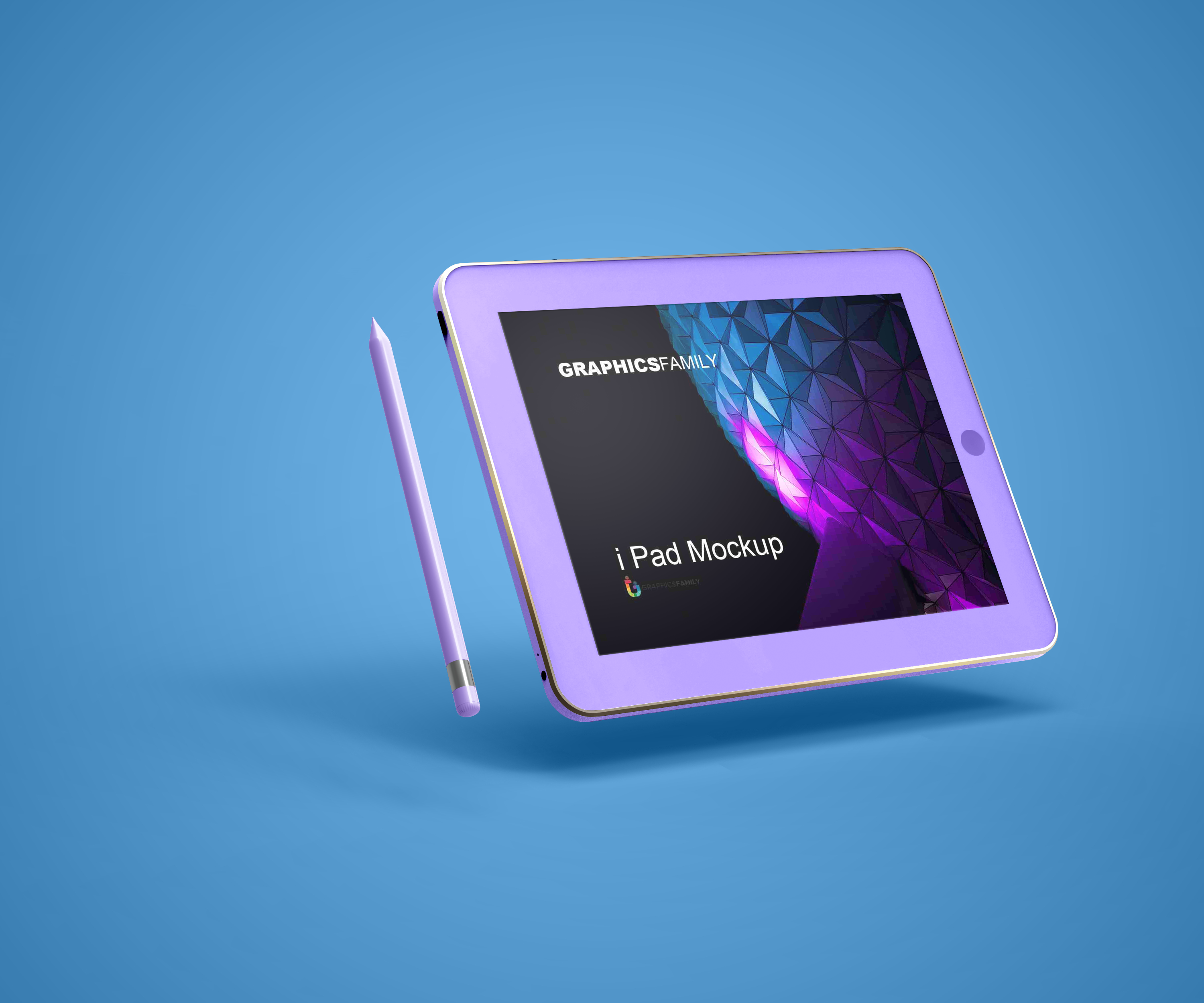 This vibrant mockup features a lavender-colored tablet and matching stylus, set against a bright blue background. The tablet showcases a geometric design with a mix of cool and warm colors. Perfect for advertising tech products or apps, this mockup can highlight your design with clarity and style. Effortlessly personalize this template using the mockup generator, then share your creation on social media to impress your audience. Try it now!