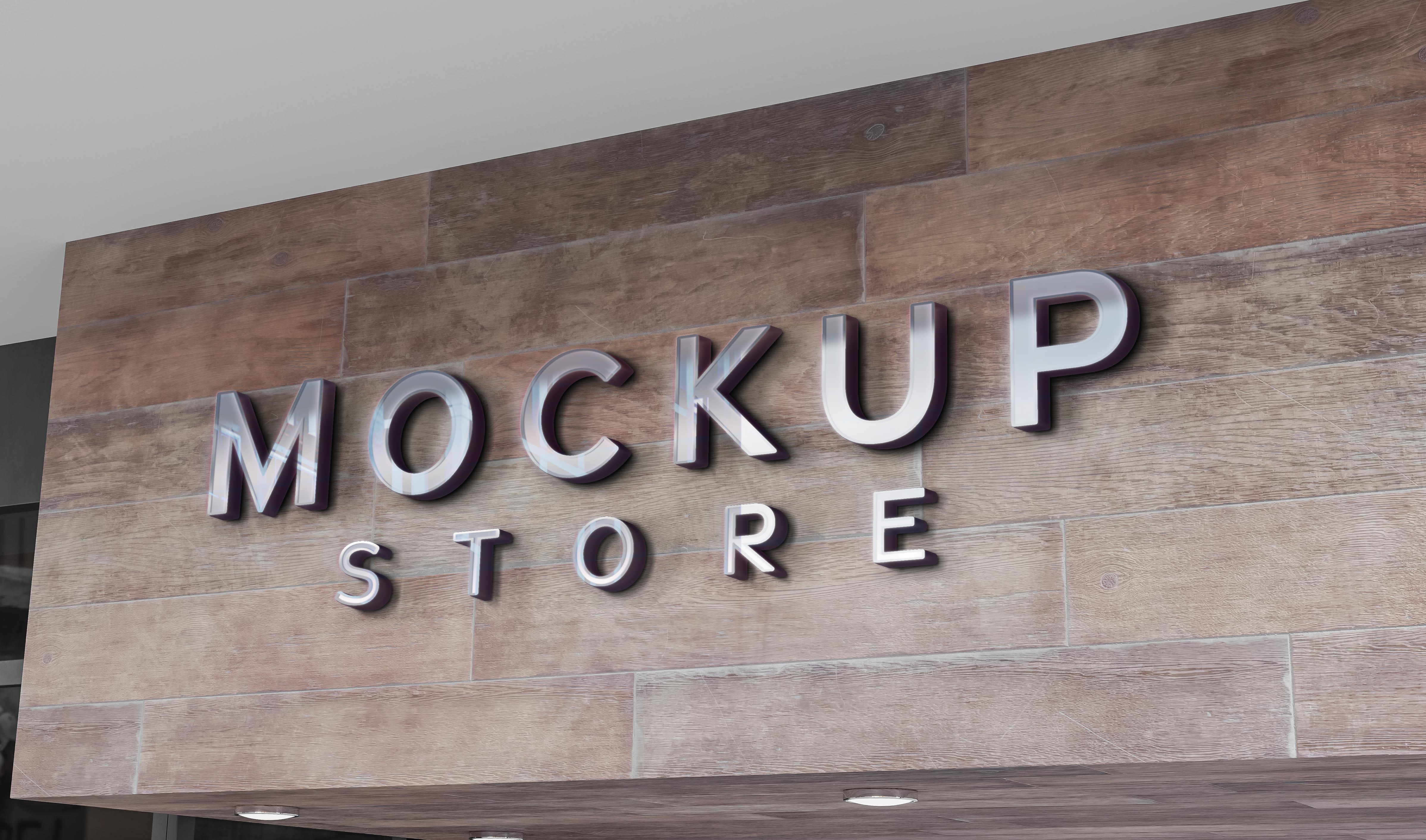 The mockup image showcases a storefront setting with a sleek wooden background. The main object is an impressive 3D sign with glossy, reflective letters. The design elements feature a contemporary, professional look ideal for advertising your brand or store logo. Use this realistic mockup to visualize your signage, impress clients, and promote your business. Try the mockup generator now and share your custom design on social media to enhance visibility and engagement!