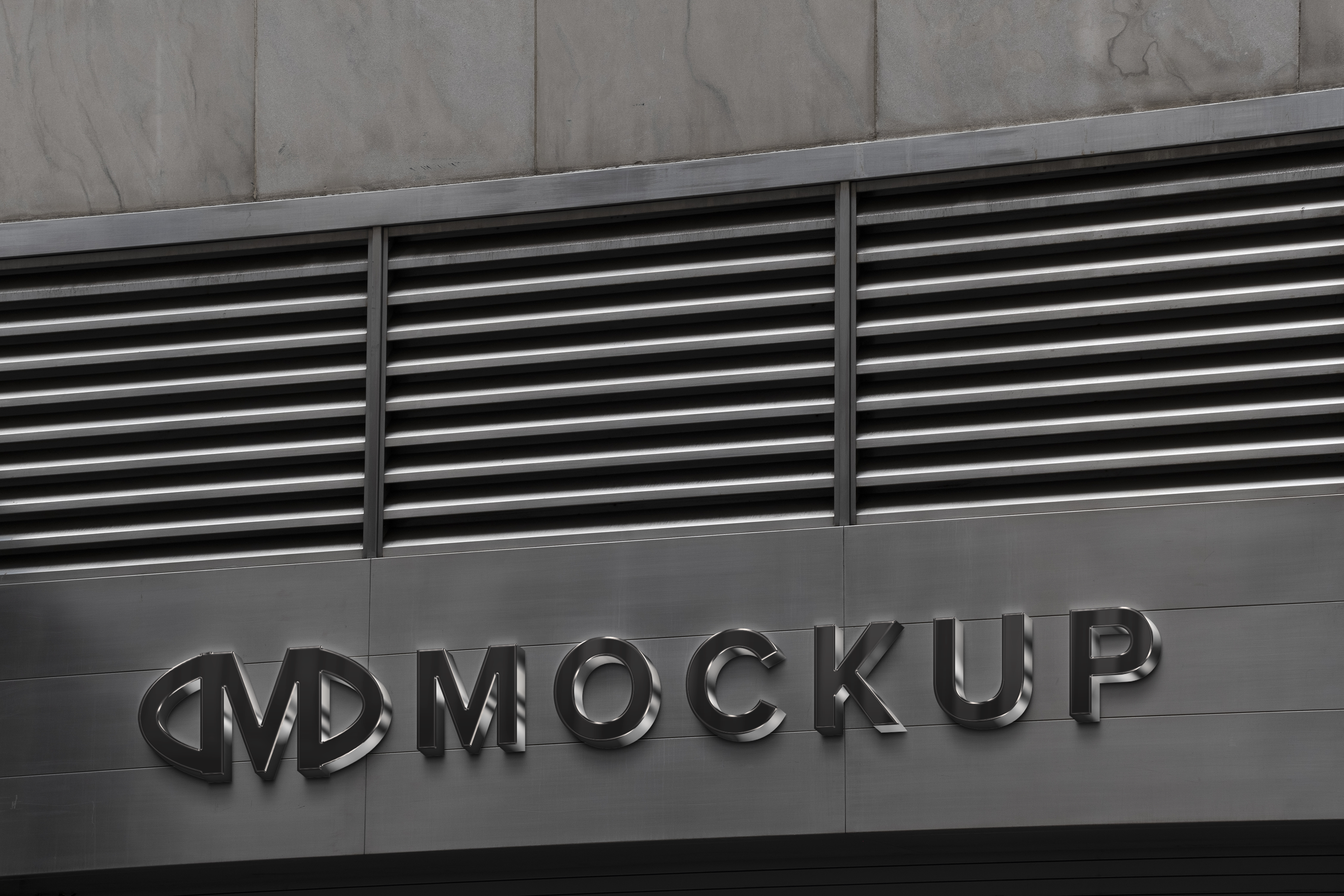 The mockup image depicts a metallic sign set against an urban backdrop featuring industrial-style slatted vents and concrete siding. The main object is a sleek, shiny metal sign with three-dimensional, bold lettering. The clean, contemporary design makes it ideal for showcasing your brand's logo or messaging. Use this mockup to create visually striking advertisements and elevate your marketing campaign. Try the mockup generator now and share your custom design on social media to engage with your audience!