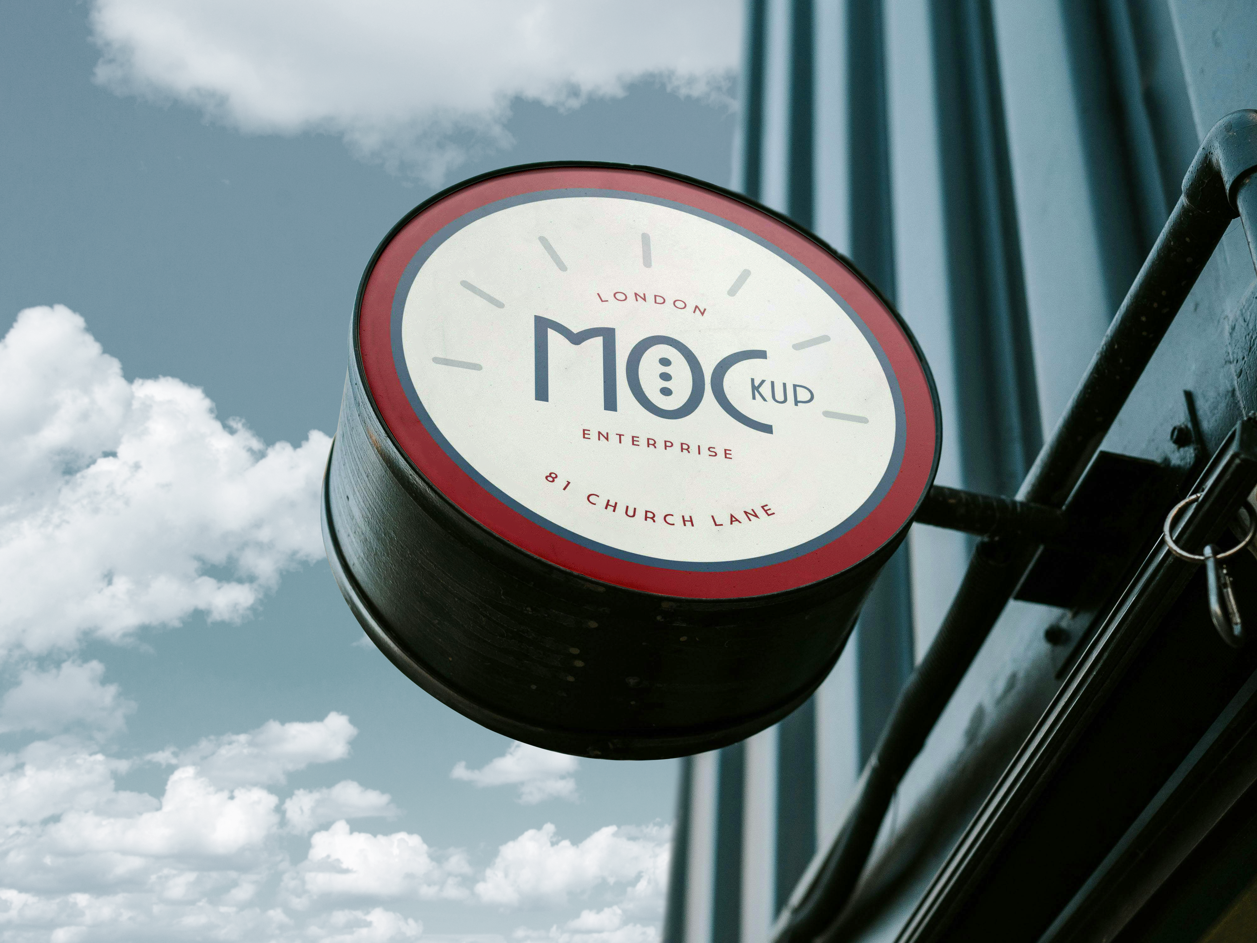 The mockup image shows a round sign mounted on a building against a clear, blue sky with scattered clouds. The sign features a sleek design with a red border and minimalist graphics. The setting is of an urban environment with the blue building extending vertically. This mockup is perfect for advertising businesses, showcasing logos or promotional messages prominently. Create your own design using this mockup generator and share your unique creation on social media to capture attention and engage your audience!