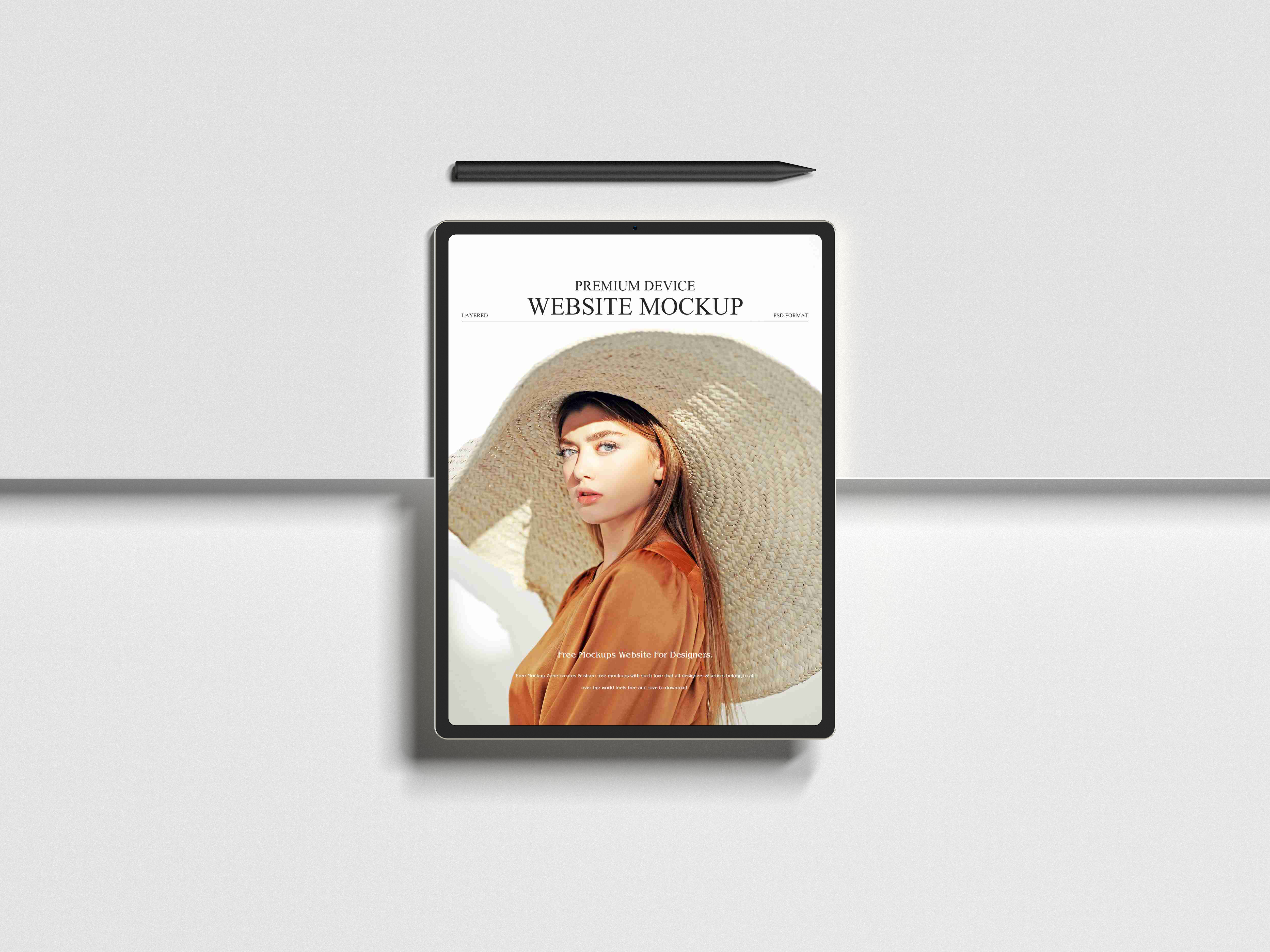 This mockup features a sleek tablet set against a minimalist white background with a light shadow. The tablet displays an image of a woman wearing a wide-brimmed hat and a stylish outfit, creating a visually striking and modern design. A digital pen is placed above the tablet, complementing the presentation. Utilize this mockup to advertise your digital products, e-books, or creative designs. Create captivating visuals using the mockup generator and share your unique designs on social media today!