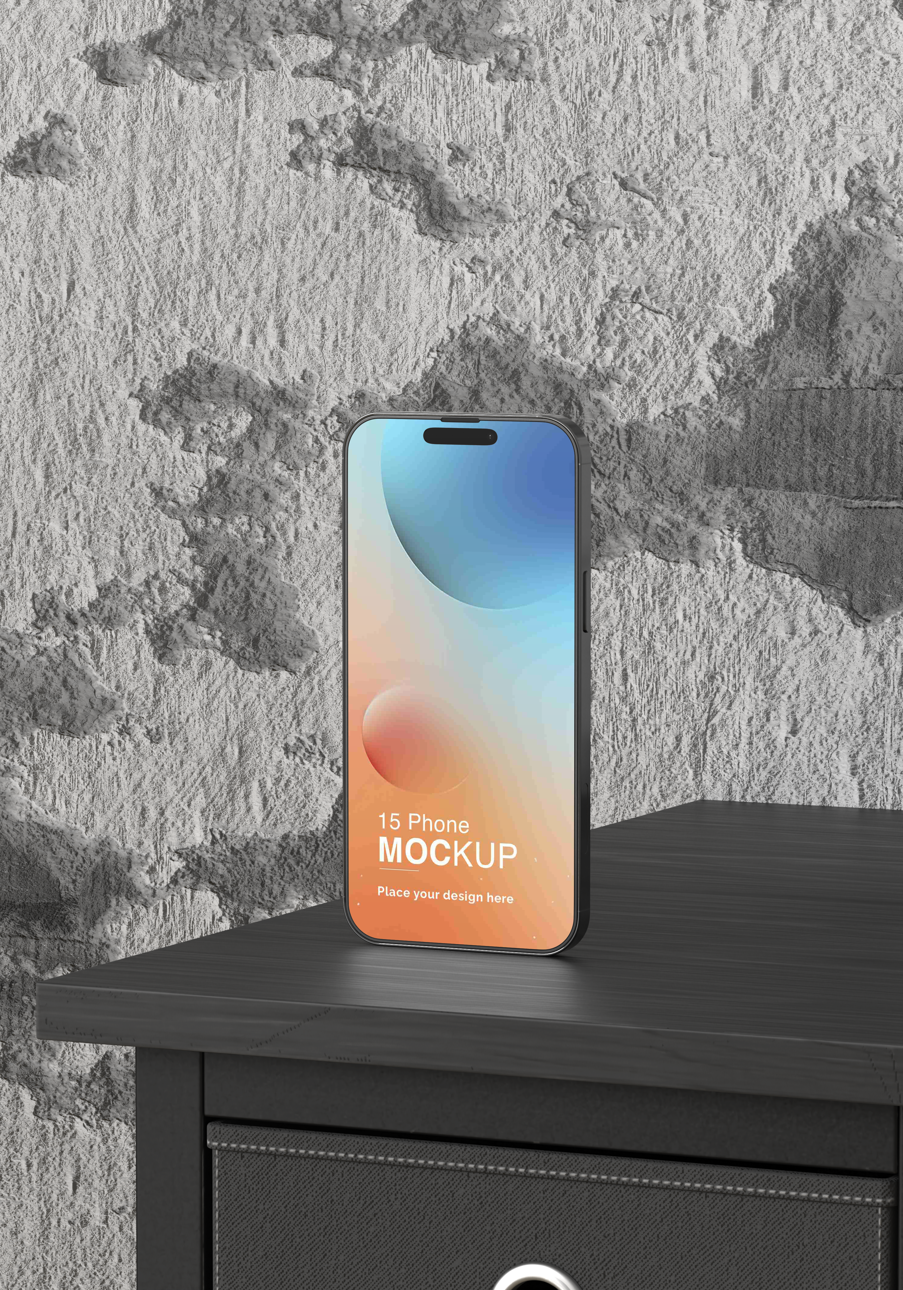 The mockup image features a modern smartphone resting on a dark wooden surface against a textured concrete wall. The smartphone displays a gradient design blending blue and peach hues. This visually striking mockup is perfect for showcasing app designs, promotional content, or branding. Leverage this attention-grabbing mockup for your advertising campaigns, ensuring your design stands out. Use our mockup generator now and share your unique creation on social media to captivate your audience!