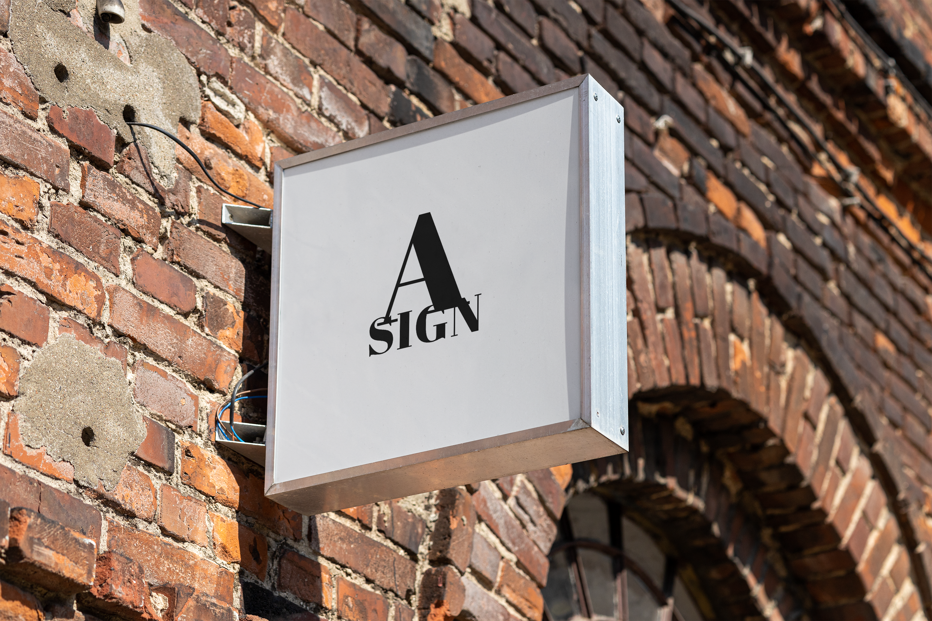 Square mockup sign with a letter "a" hanging on a brick wall background.
