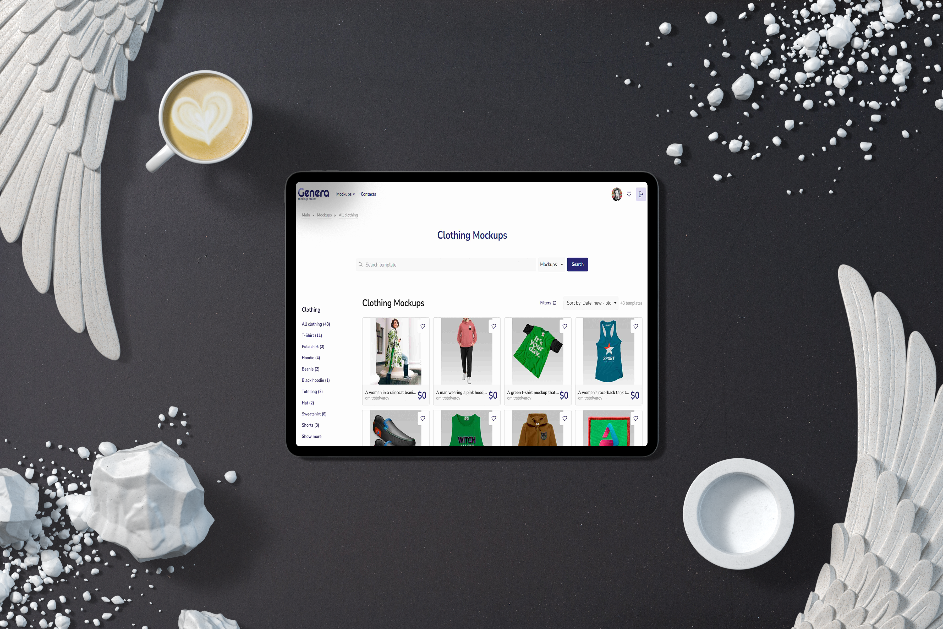 Set against a sleek, dark background, this mockup showcases a tablet featuring a grid of clothing designs. Surrounding the tablet are artistic elements, including angel wings, a latte with a heart design, and white ornamental fragments. This creative and modern setting makes it ideal for advertising fashion and tech products. Use this stylish mockup to highlight your designs and share your unique creations on social media. Try the mockup generator today and make your brand stand out!