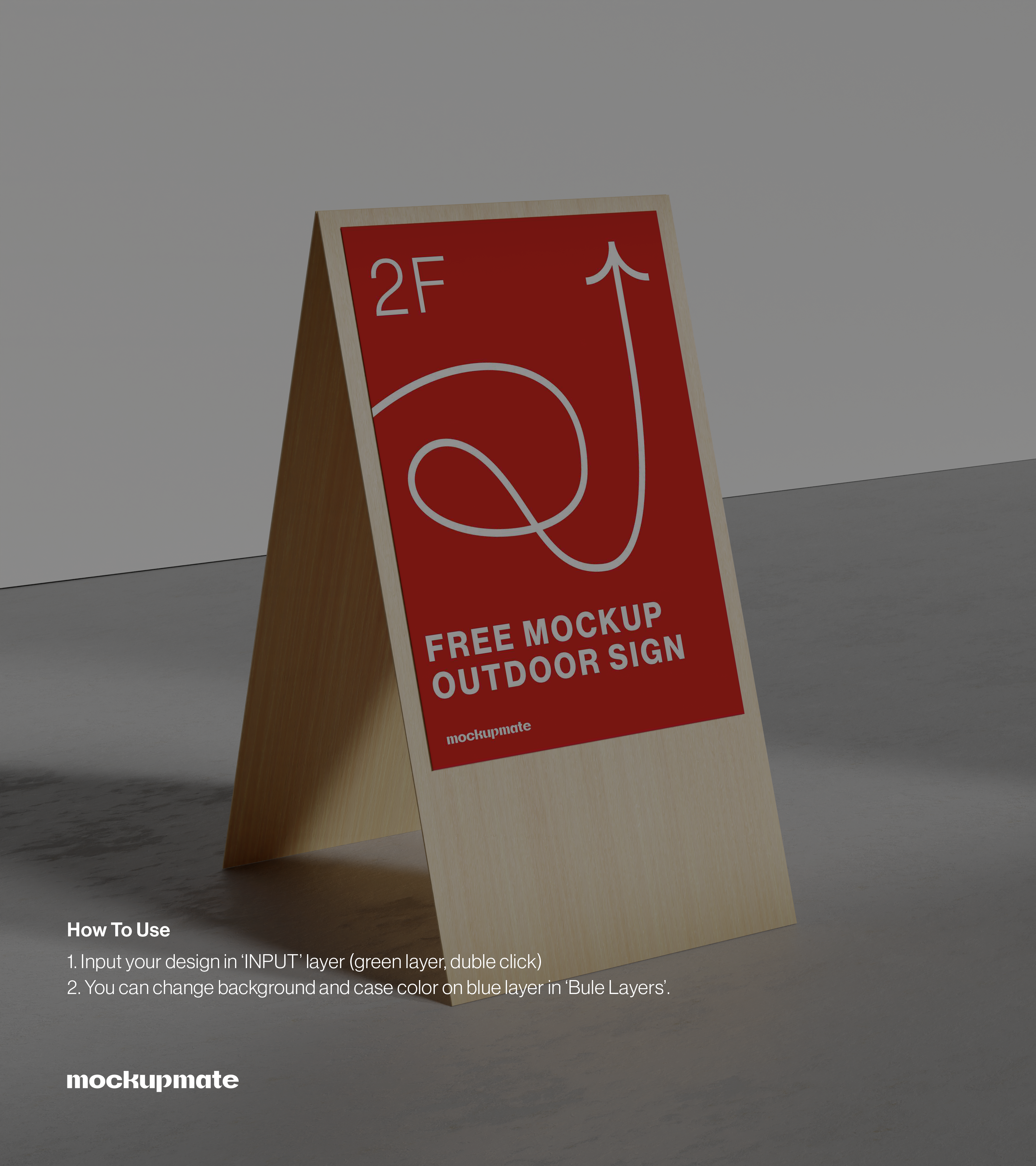 Tabletop sign mockup with an arrow indicating direction to the second floor.