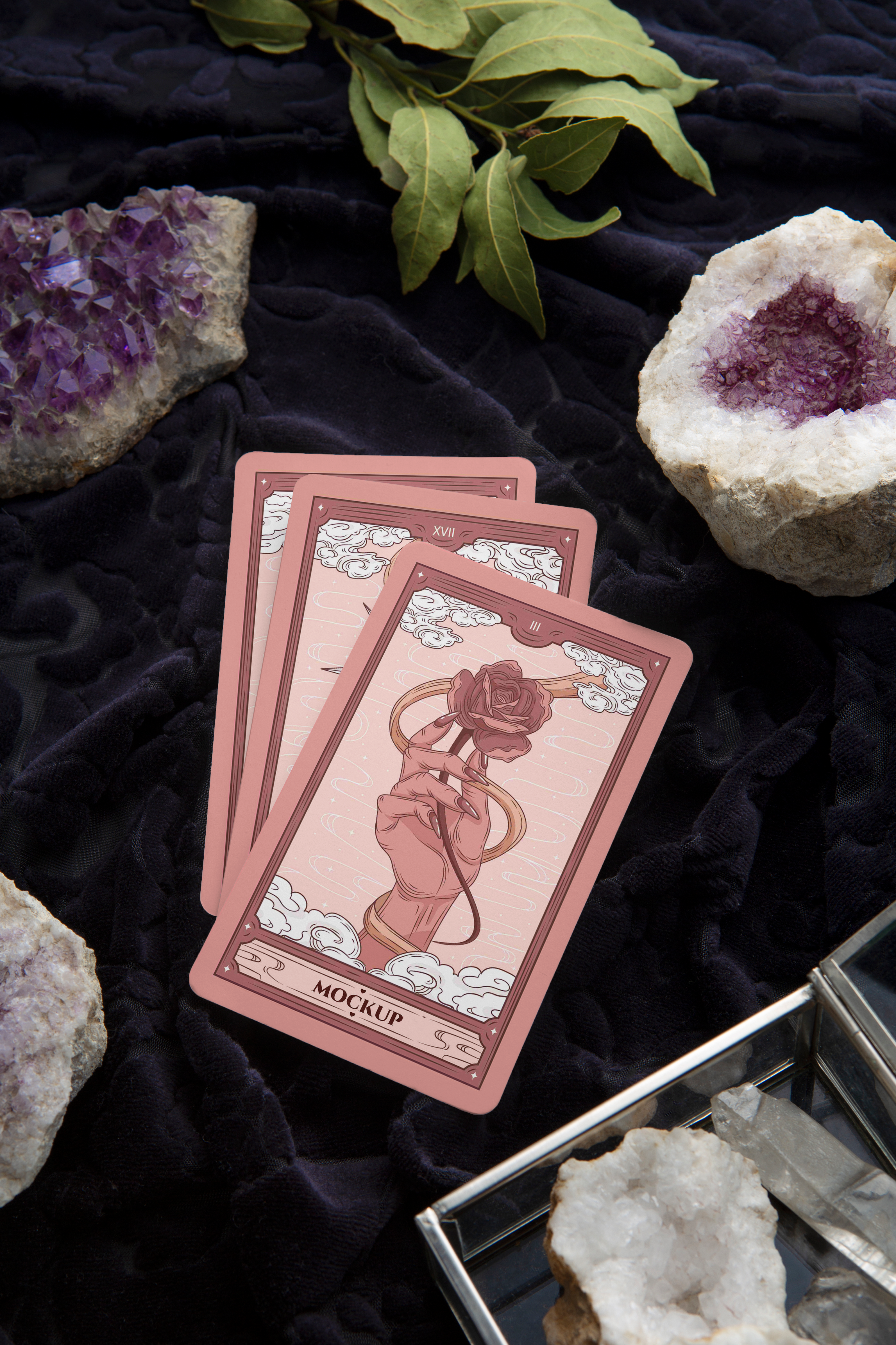 The mockup image features tarot cards on a dark, velvety background, surrounded by crystals and green leaves. The main card shows an illustrated hand holding a rose, framed by clouds and adorned with elegant lines and borders in soft pink hues. This visually striking image can be used for advertising various products such as spiritual shops, metaphysical services, or art prints. Use the mockup generator to create your own design and share it on social media to attract potential customers.