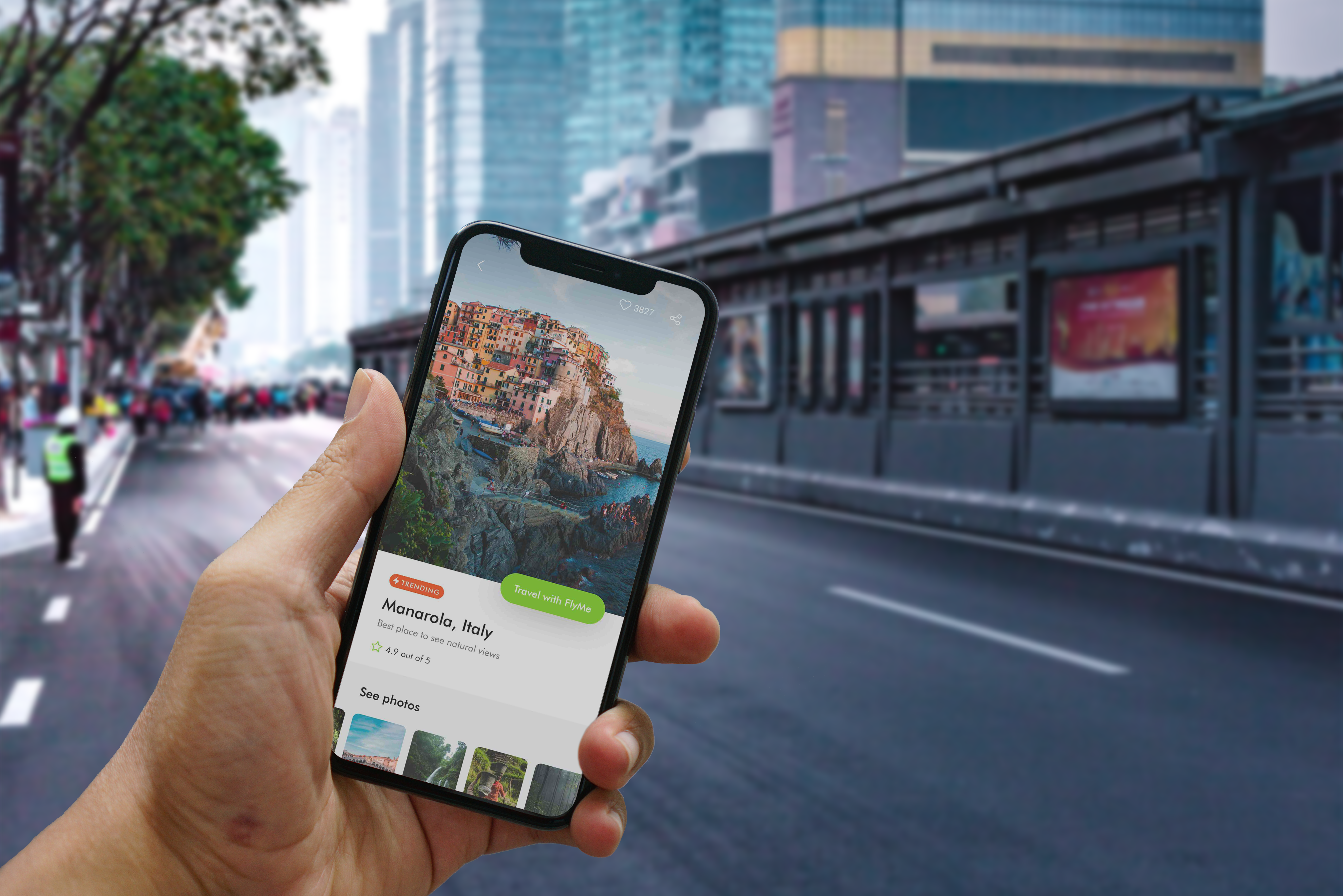 This mockup image displays a hand holding a smartphone with a travel app interface, showcasing an image of Manarola, Italy. The setting is an urban street with a blurred background featuring high-rise buildings and a bus stop. The app interface includes vibrant design elements such as a trending tag and a green call-to-action button. Use this mockup to advertise your travel or app-related business dynamically. Start using the mockup generator now and share your stunning designs on social media!