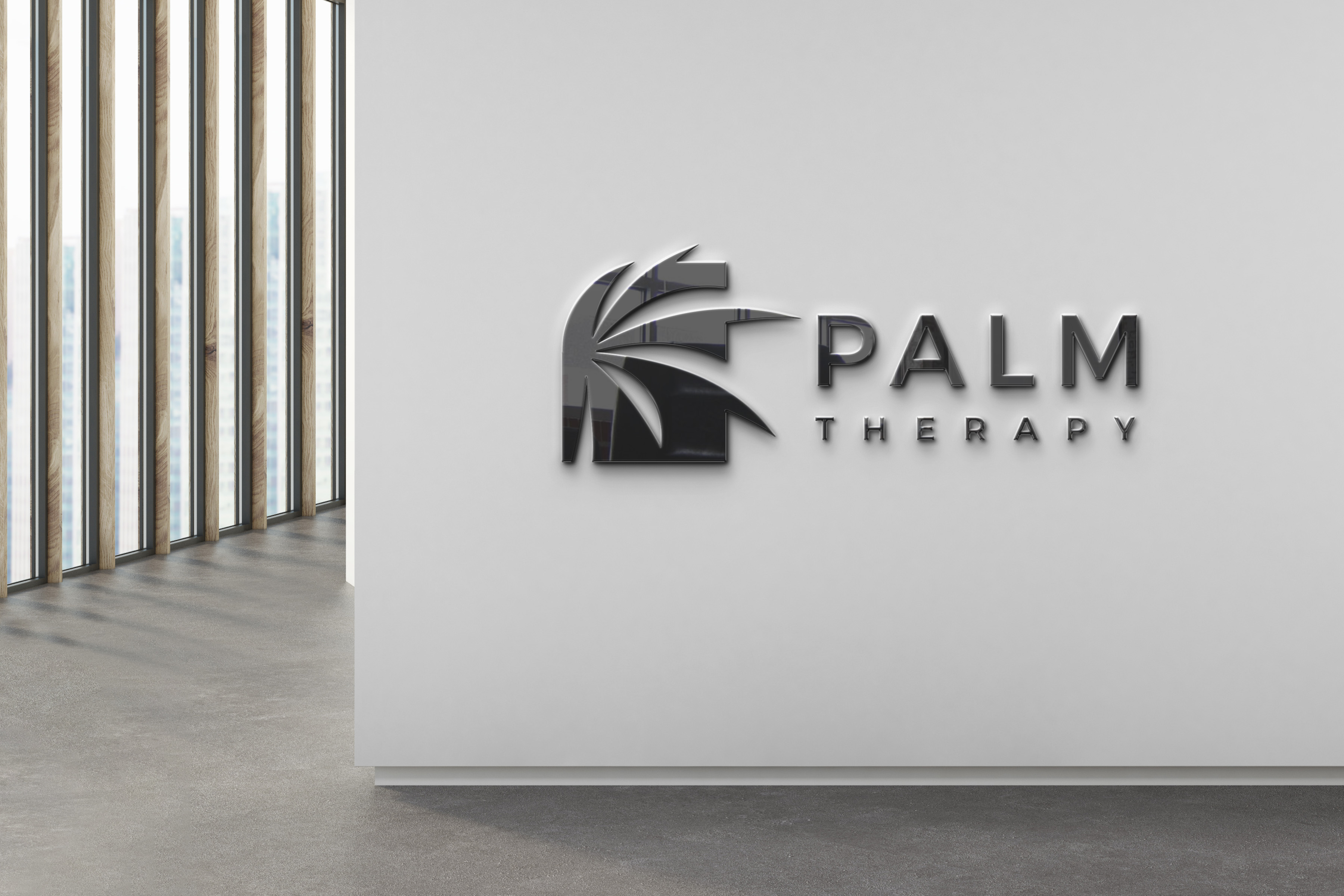 The logo on the wall reads "Palm Therapy" with a design resembling palm leaves, creating an inviting atmosphere. Vertical wooden slats serve as the perfect backdrop for this elegant mockup.