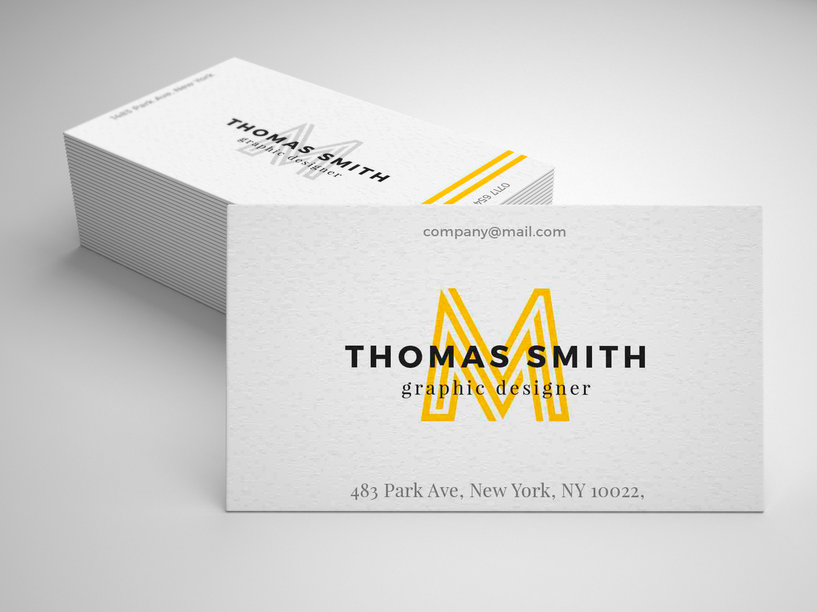 This mockup image features a stack of business cards against a clean, minimalist background. The primary focus is a single business card displaying a modern design with a bold yellow "M" and sophisticated black text. This mockup can be ideal for advertising branding services or showcasing design portfolios. Utilize this mockup generator to highlight your professional details and share your custom design on social media to attract more clients and stand out in your industry!