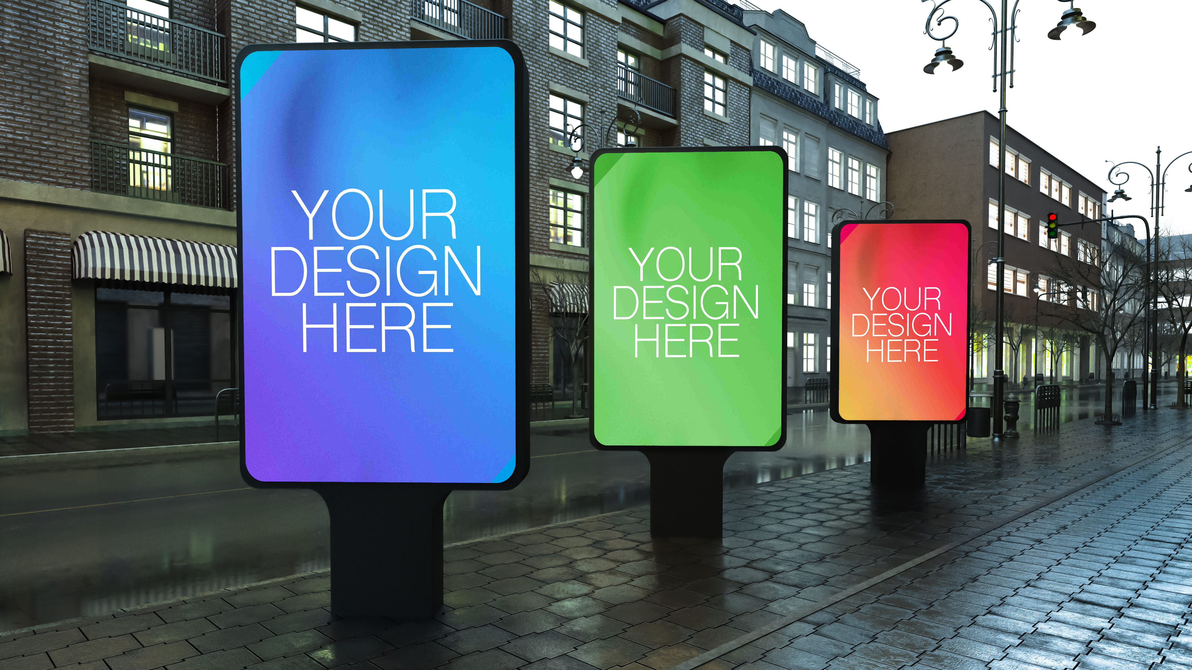 Three colorful billboards on a city street, creating a perfect template for showcasing advertising creativity.