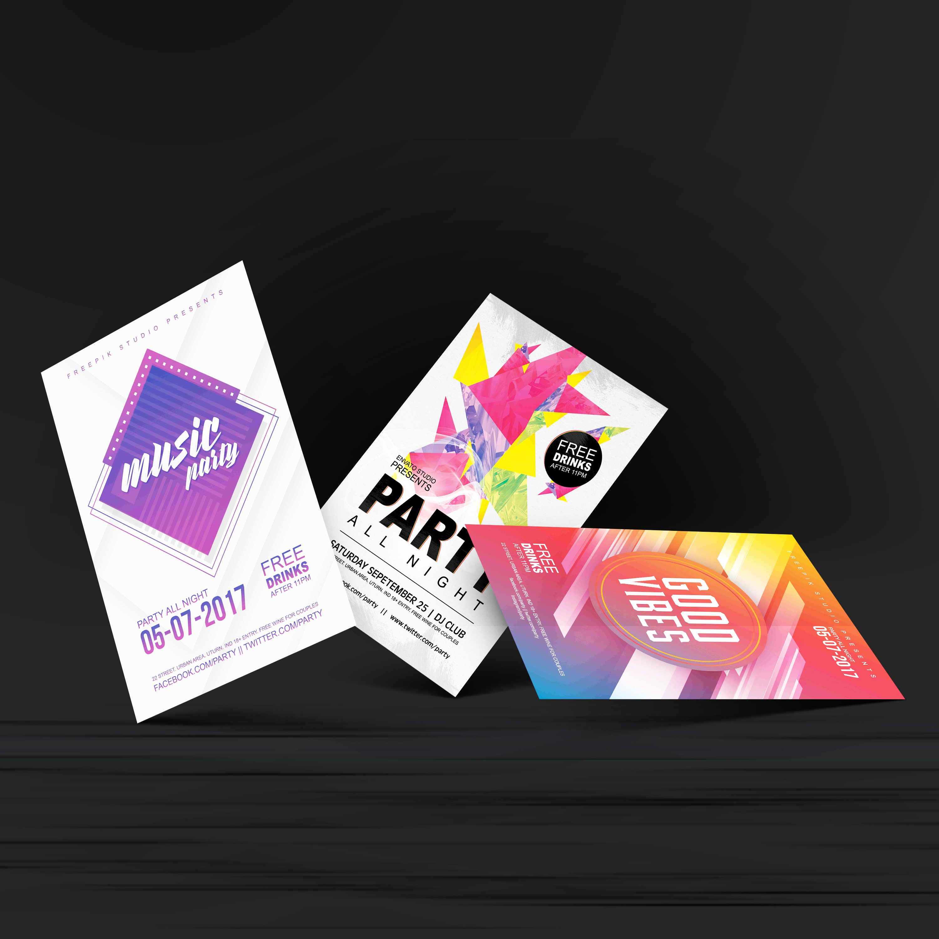 The mockup displays three vibrant flyer designs set against a sleek, dark background with subtle texture. Each flyer features colorful geometric shapes, bold fonts, and dynamic elements, perfect for promoting events like music parties and nightlife gatherings. Use this mockup for advertising purposes by inserting your event details and eye-catching graphics. Utilize our mockup generator to create professional and engaging designs, then share your creations on social media to boost visibility and attract attendees. Start designing now and let your promotion shine!