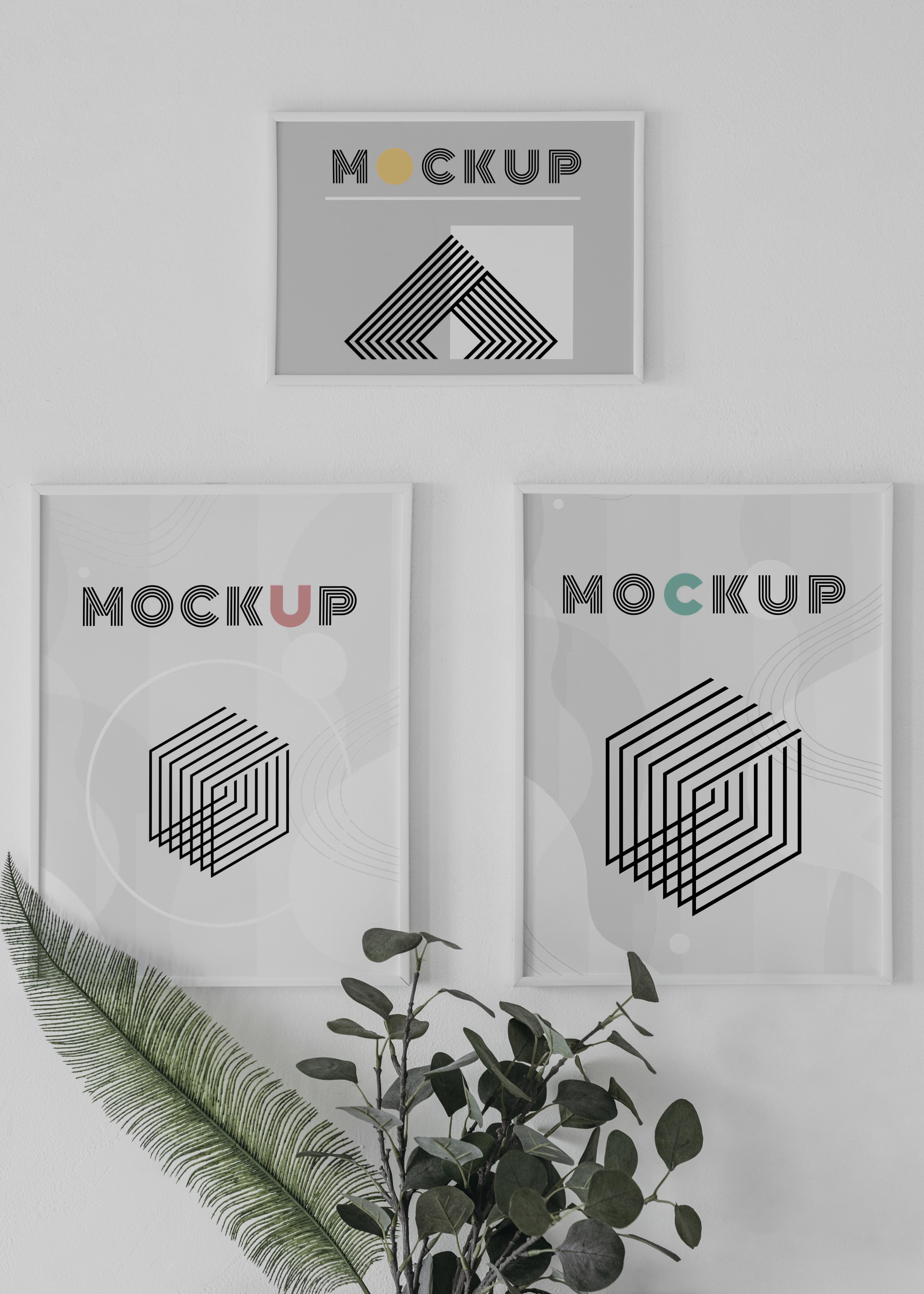 The mockup image showcases a minimalist indoor setting with a clean, white wall background. Three framed posters with geometric designs are the main focus, with abstract line patterns forming intricate shapes. The designs are bold and modern, perfect for contemporary advertising. At the bottom, green plants add a touch of nature, enhancing the serene ambiance. This mockup is ideal for visualizing your artwork or promotional content in a sleek, stylish format. Start using the mockup generator today and share your unique designs on social media!