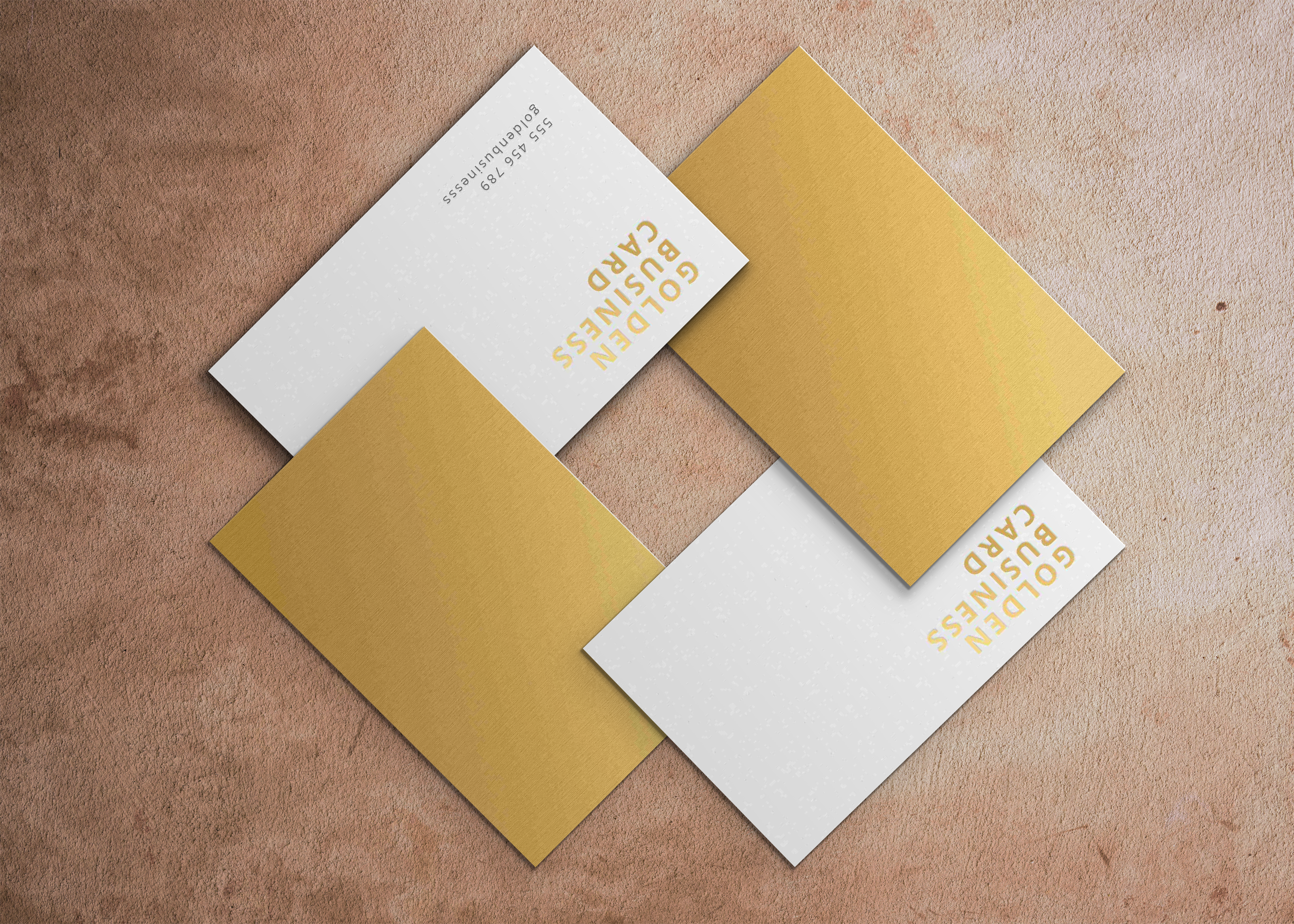 The mockup image features a minimalistic setting with a light brown textured background. The main objects are four business cards, with two in gold and two in white, arranged in a diamond-like shape. The cards have sleek gold accents, adding a sophisticated touch. This mockup is ideal for advertising professional and elegant business card designs. Use the mockup generator to create your own stunning designs and share your creations on social media to captivate your audience!